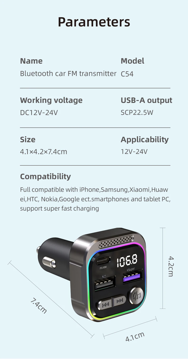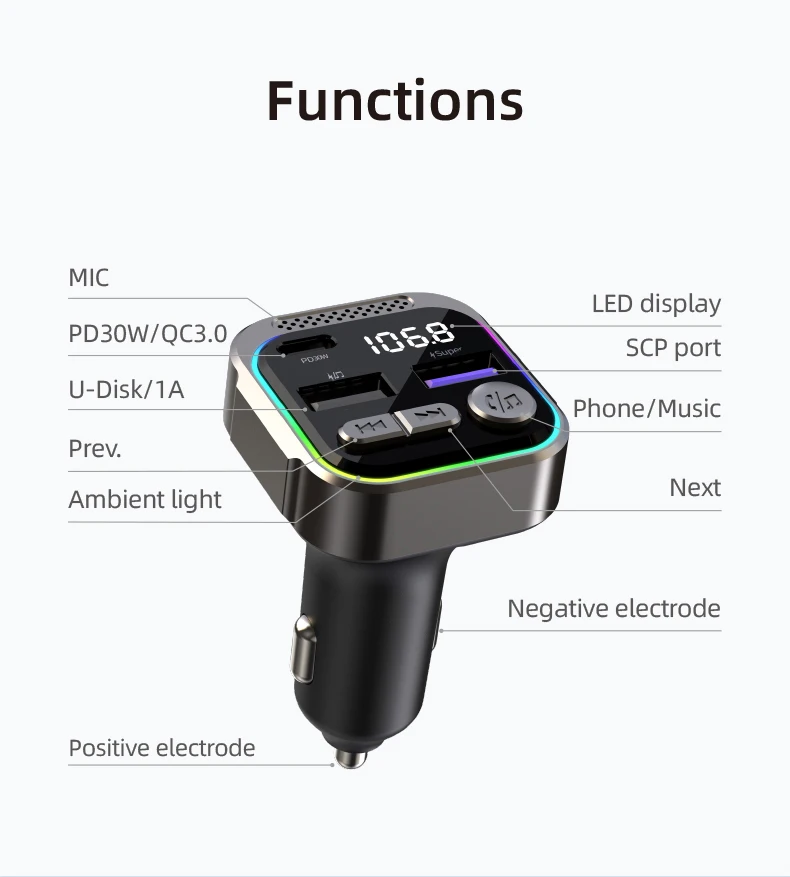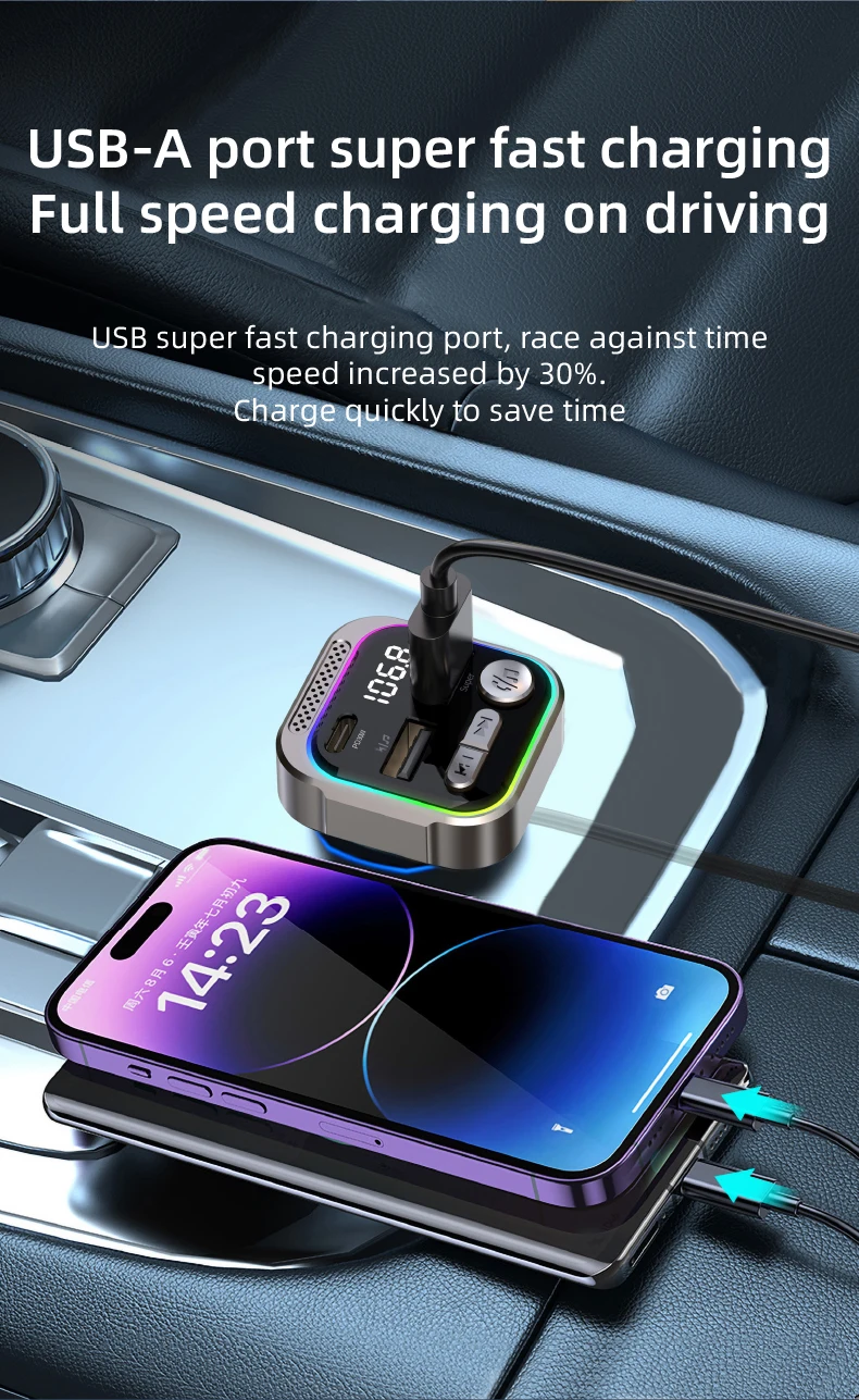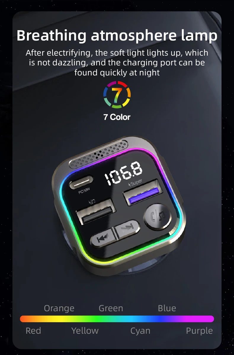 Bluetooth FM Transmitter Zinc Alloy PD30W Fast Charger Audio Receiver Car MP3 Player Handsfree Kit QC3.0 With Atmosphere Light