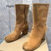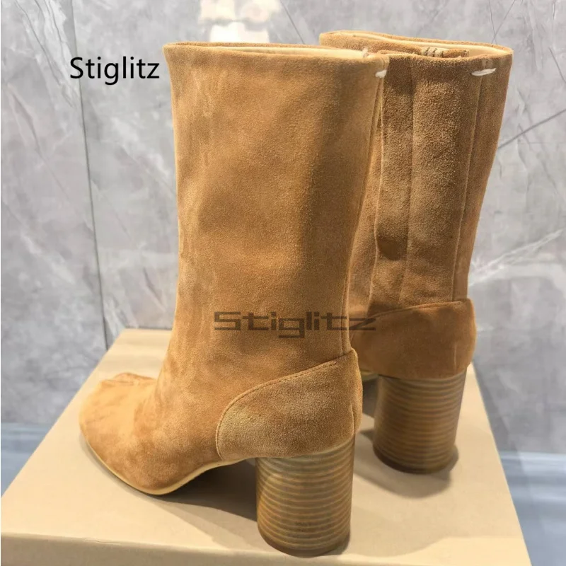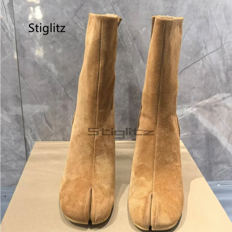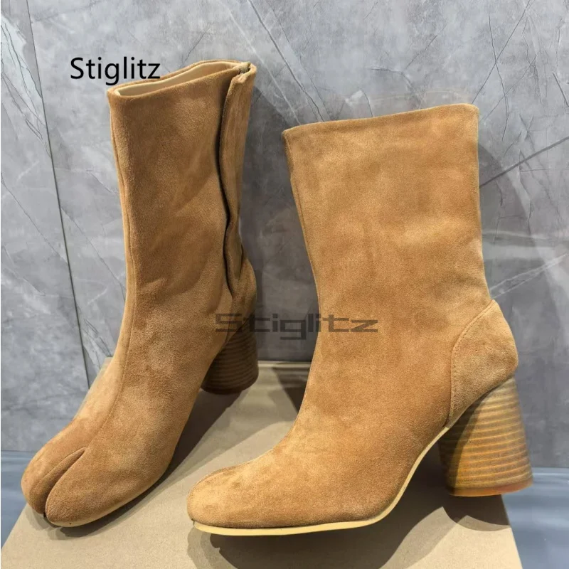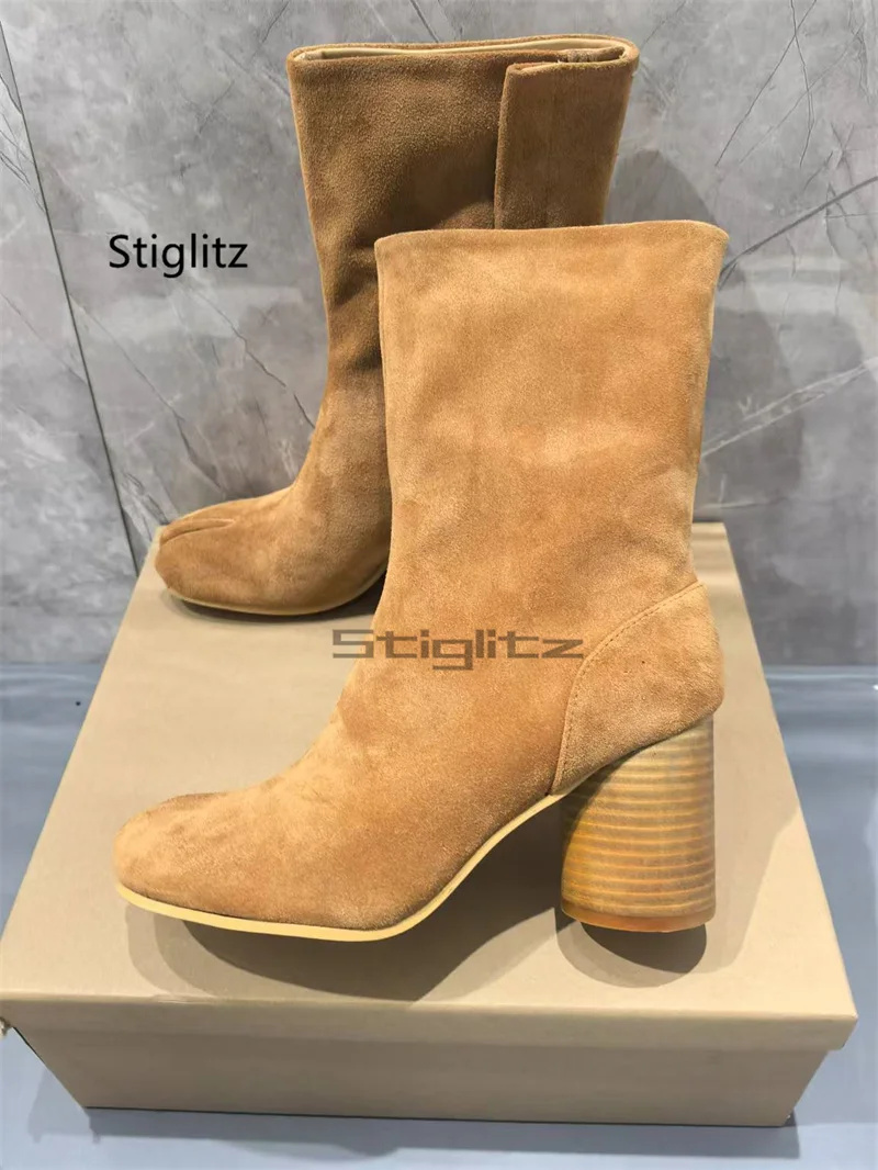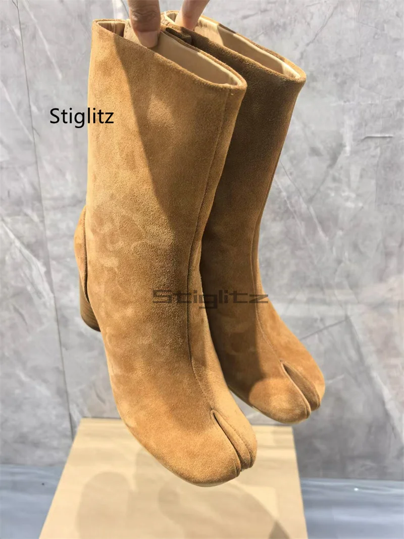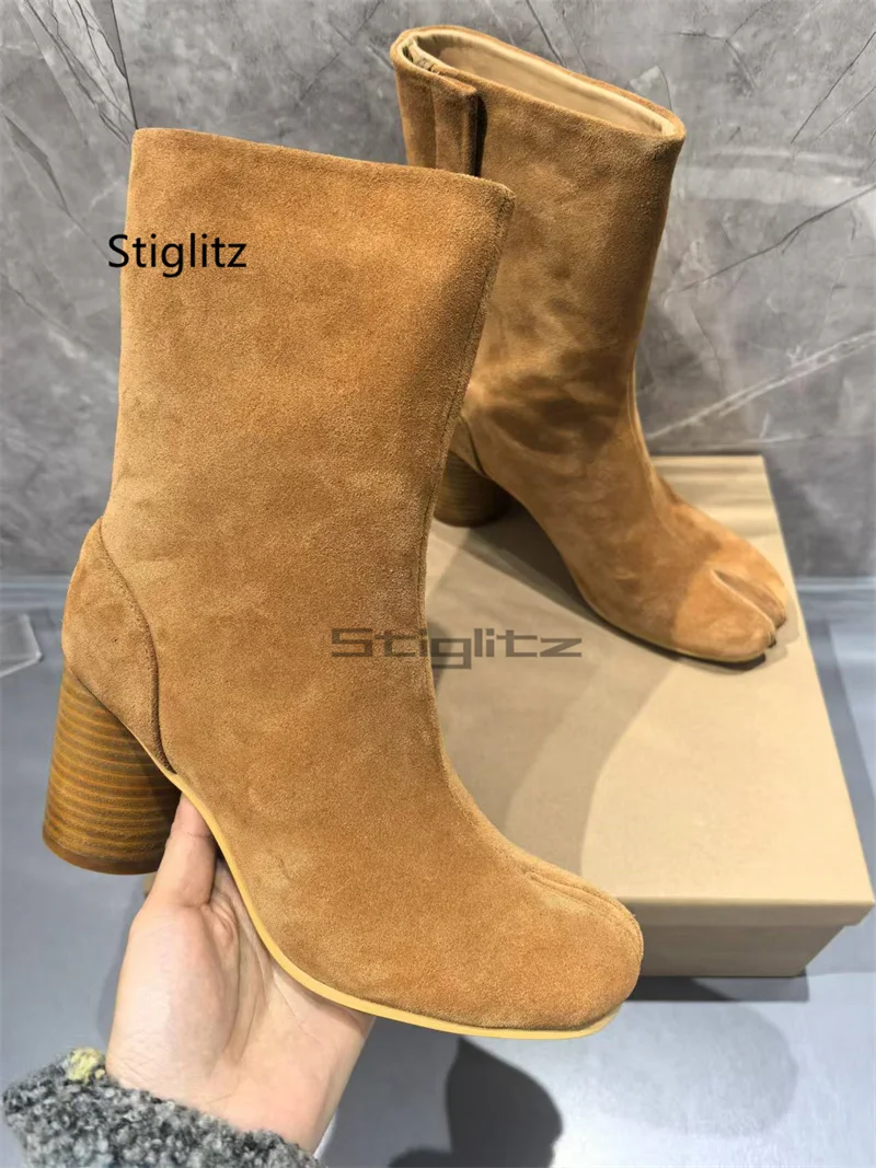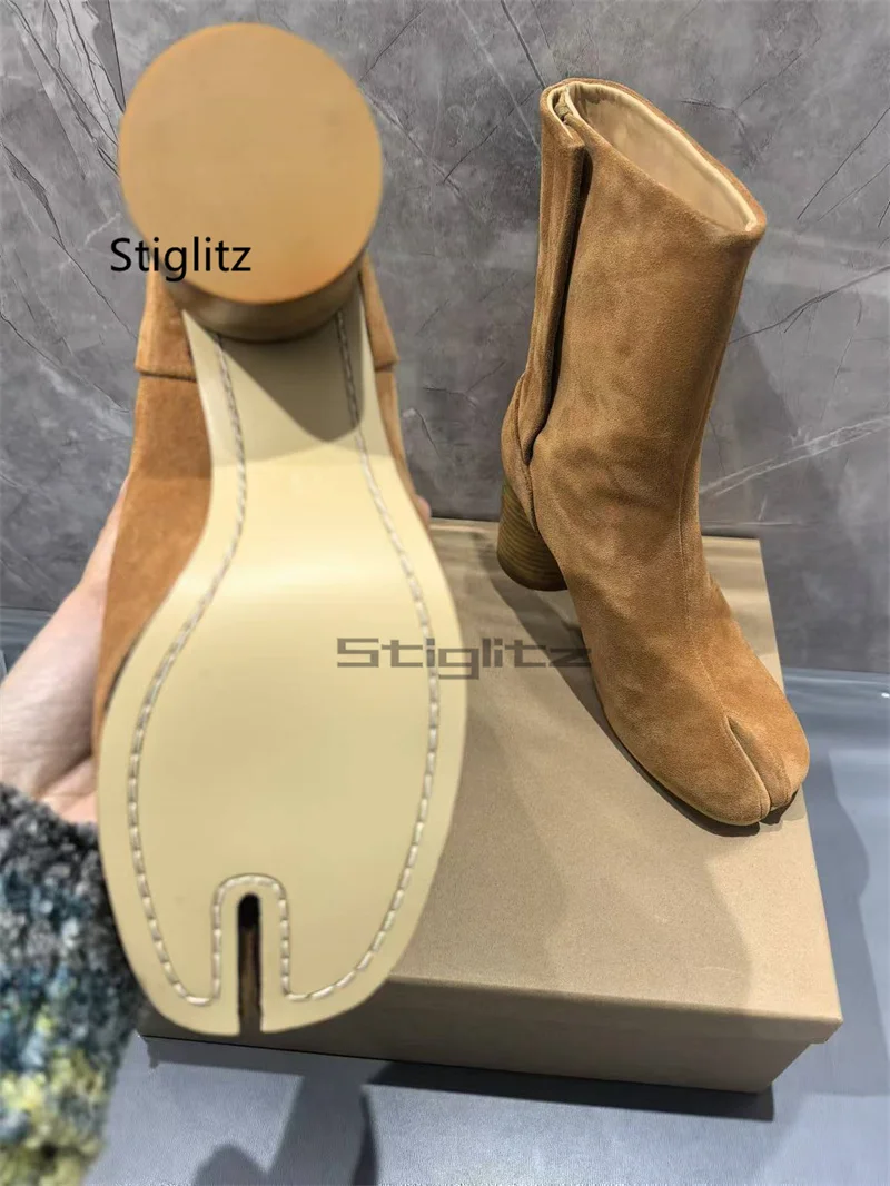 Brown Split Toe Tabi Boots for Men Buckle Round Chunky High Heels Ankle Boots Women Luxury Design Novelty Autumn Winter Shoes