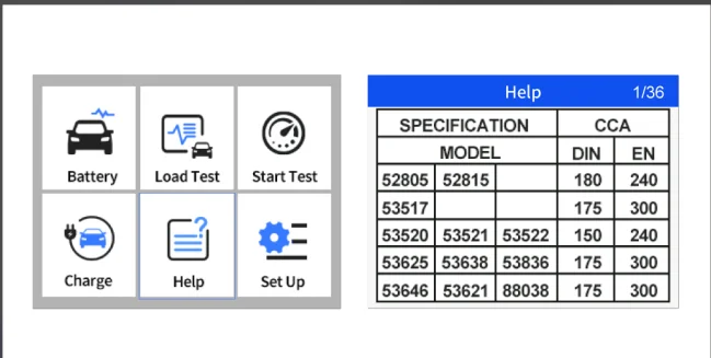 Go to [Help], the tester displays the battery table, which can be viewedby pressing the up and down keys to page through.