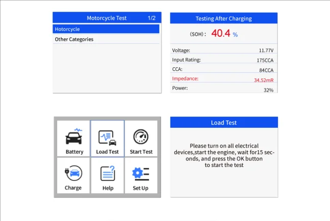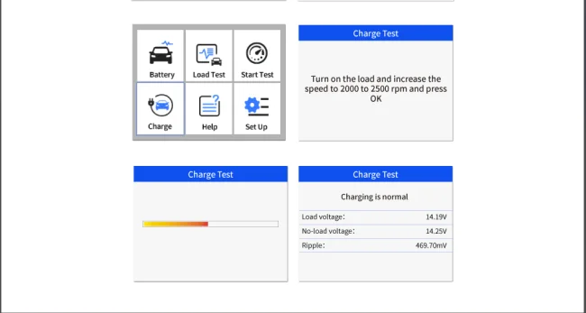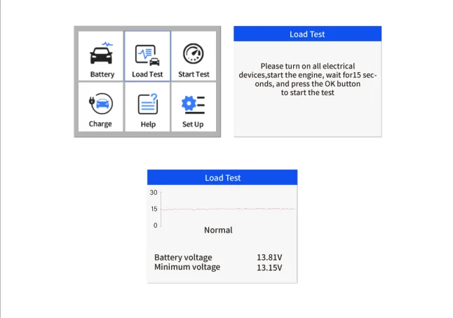 Select [Load Test] and press Ok, according to the prompts, you canquickly check the battery voltage status.