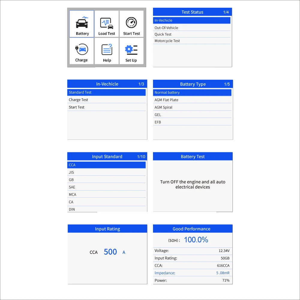 Select [Standard Test] and press OK, choose in-vehicle or out-of-vehi-cle according to the situation, select the standard test, select the corre-sponding battery mode according to the type of battery, and operate according to the prompts to analyze the health status of the battery.