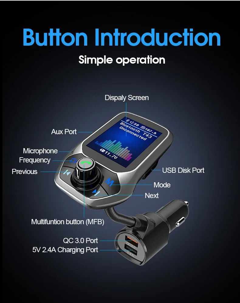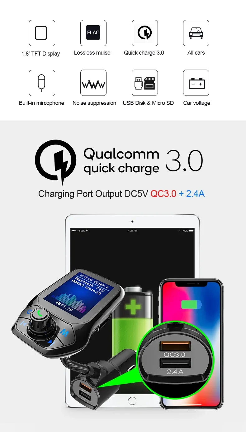 Car MP3 Music Player Bluetooth 5.0 receiver FM transmitter Dual USB QC3.0 Charger U disk / TF Card lossless Music