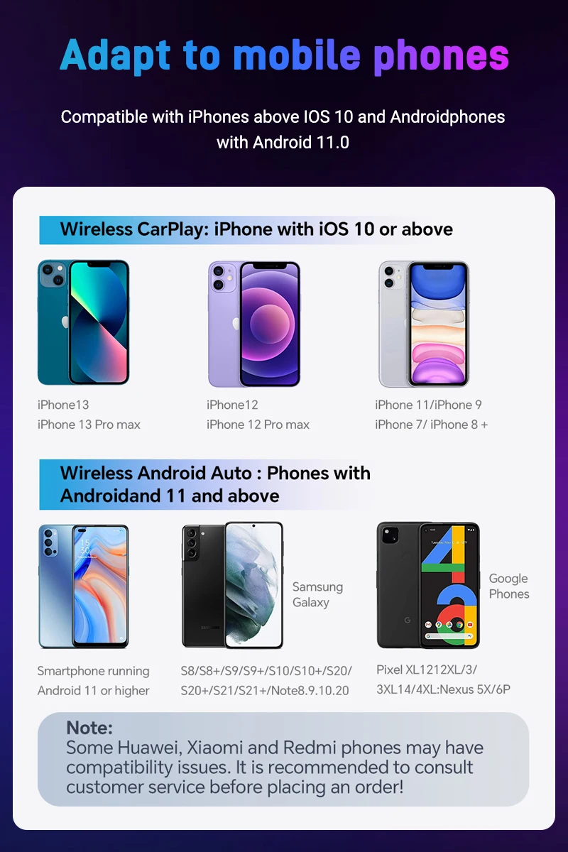 4. For Android Auto: Supports Android 11 and above models, and the phone supports wireless Android Auto. It should be noted that Huawei phones are special. Huawei devices have their own mobile operating system – EMUI. Unfortunately, Android Auto Wireless does not support EMUI.