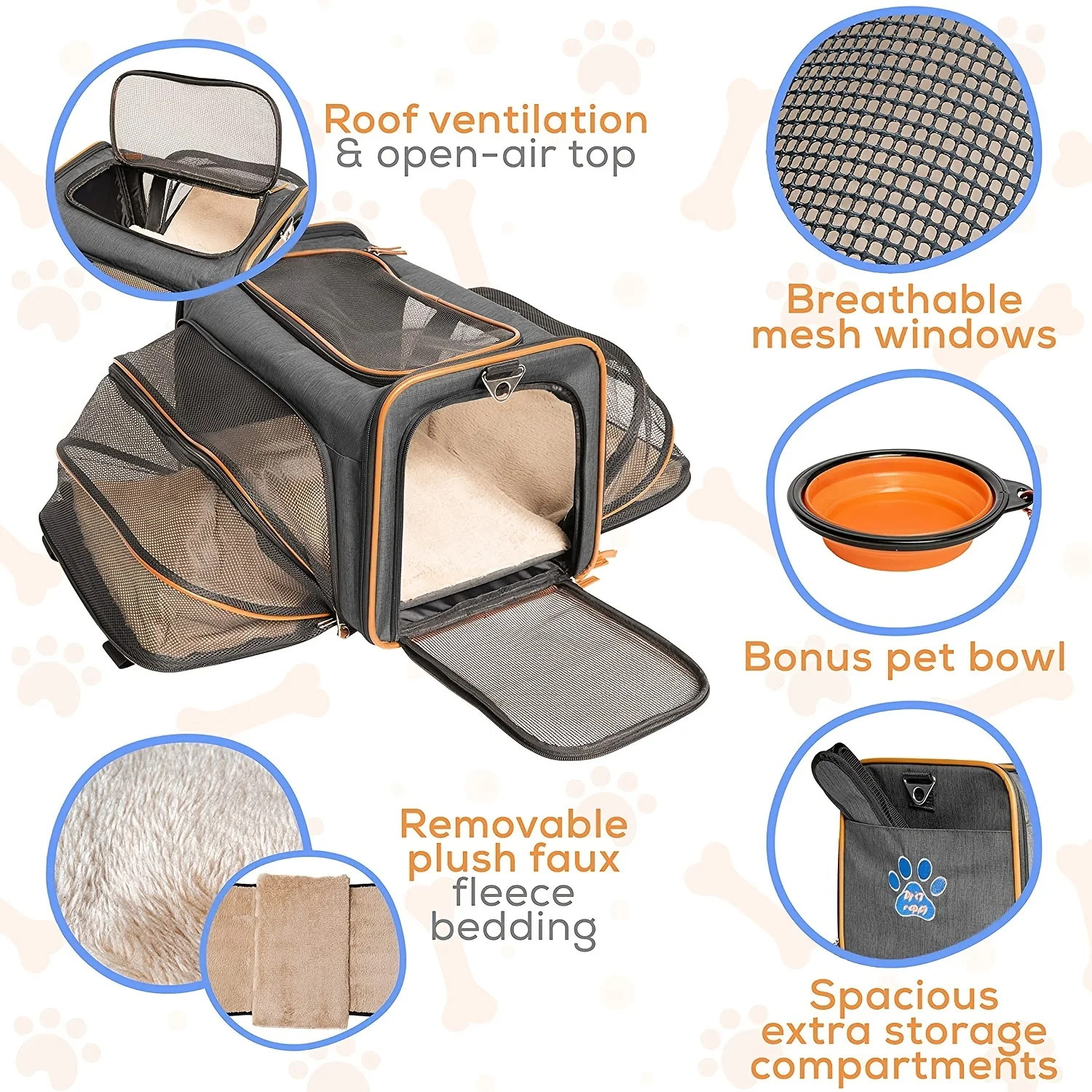 Pet Carrier with Added Flexibility: Ideal for small pets, this carrier’s extendable sides provide a spacious environment during rest stops or in-flight. It’s built with durable, airline-compliant materials and features a removable fleece mat for easy cleaning.