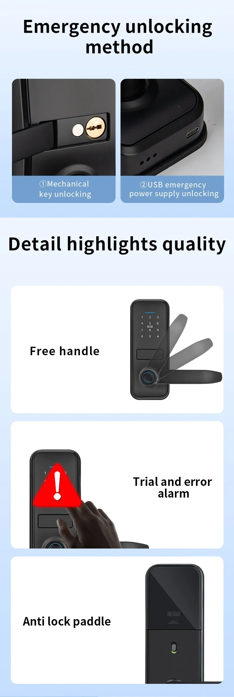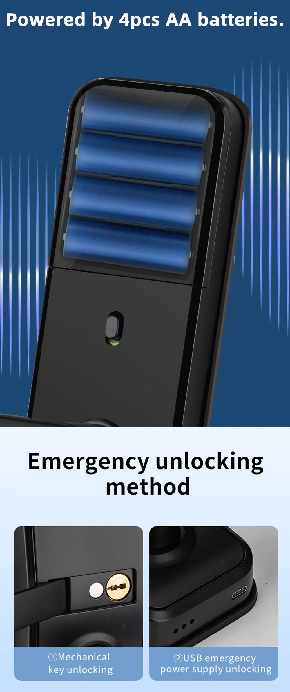 Mechanical keys and emergency power supply (USB) can be used when the door lock is out of power.