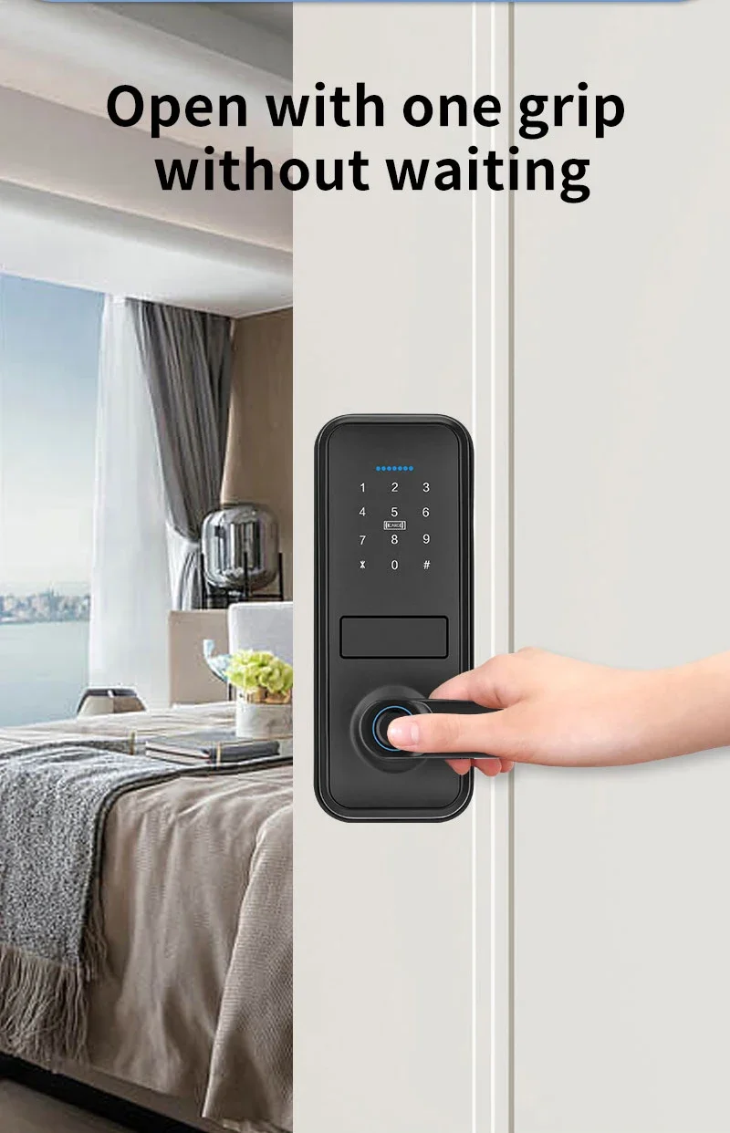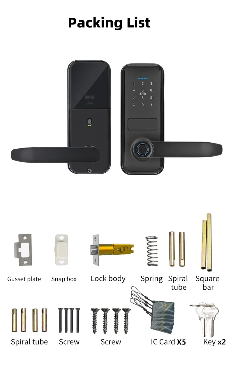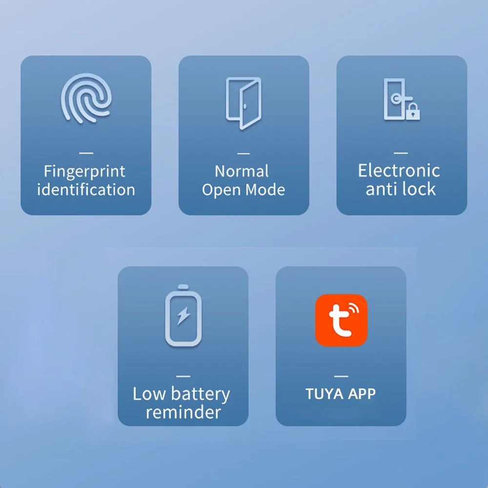 Unlocking mode: Fingerprint/Password/Swipe card/Key/TUYA APP
