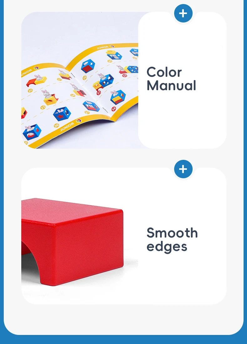 This is a cute children’s educational learning toy. The game has a total of 60 challenges. According to the combination pattern of the cards, rabbits and blocks are placed. If the combination shape seen from the front is consistent with the one on the card, the challenge is successful.