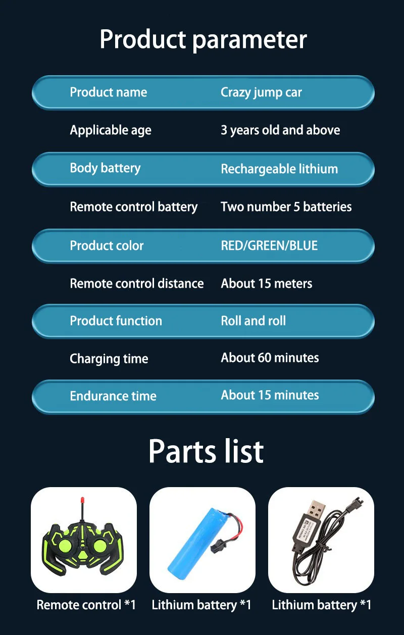 Children’s Crazy Jumping Car Dancing Stunt Car Toy with USB Charging, Lights, Music Remote Control, Car Toy Exercise Sound Sense