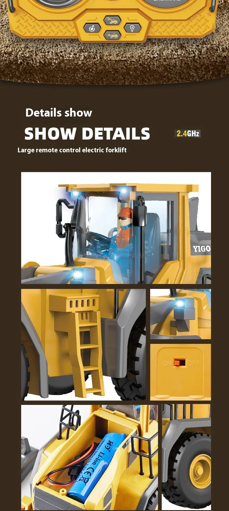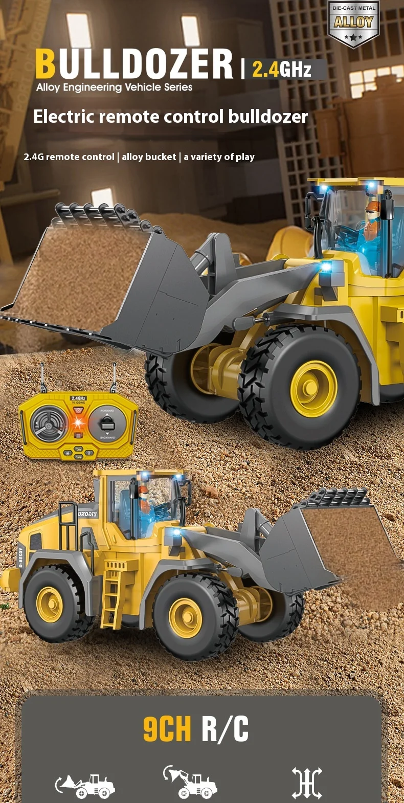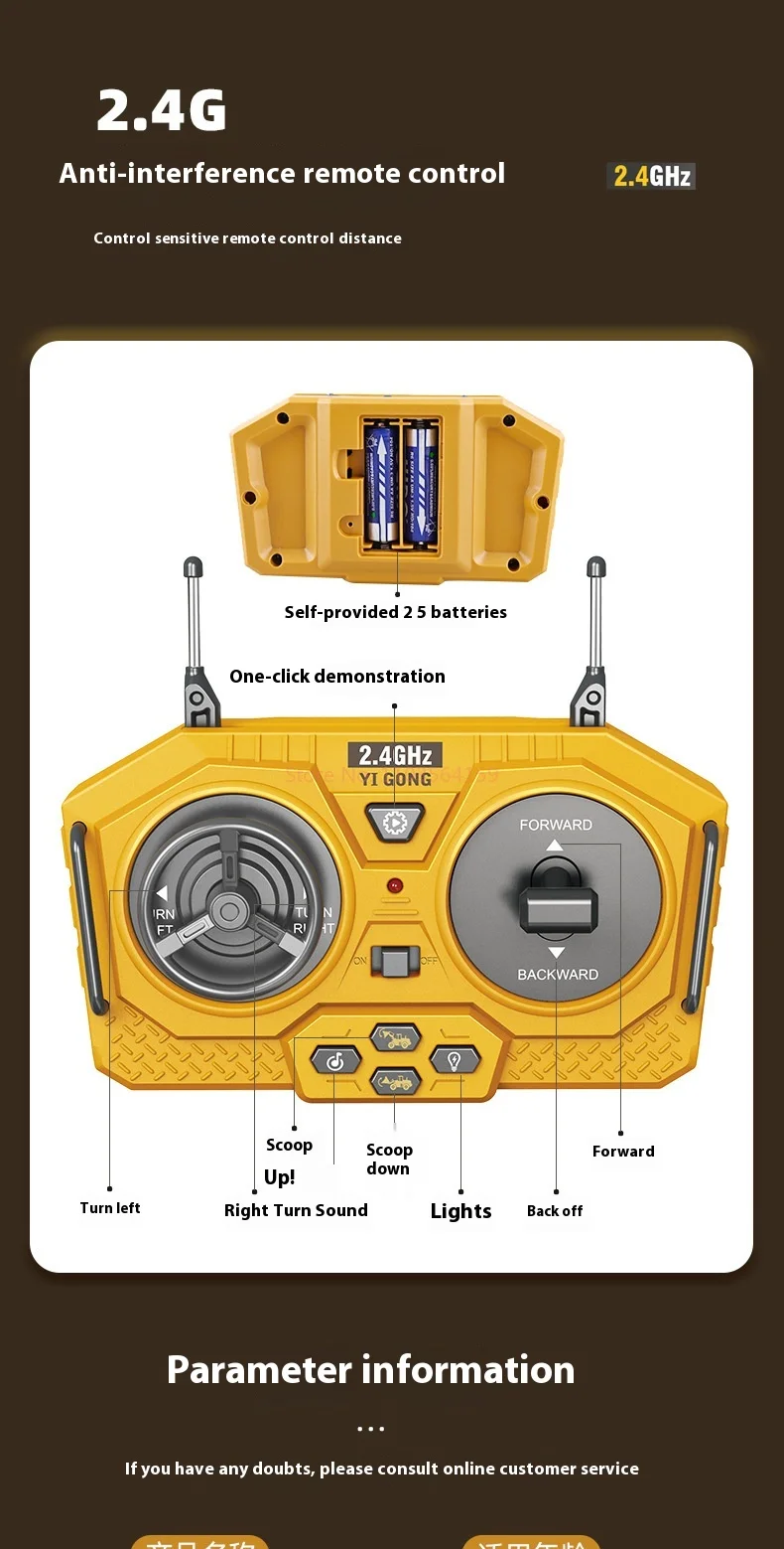 Nine channel functions: forward, backward, left turn, right turn, 360 ° rotation, front and rear lights, bucket up, bucket down