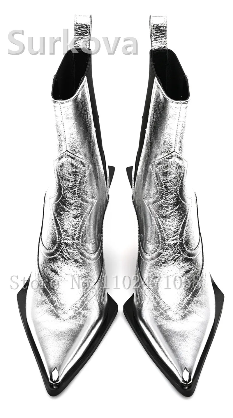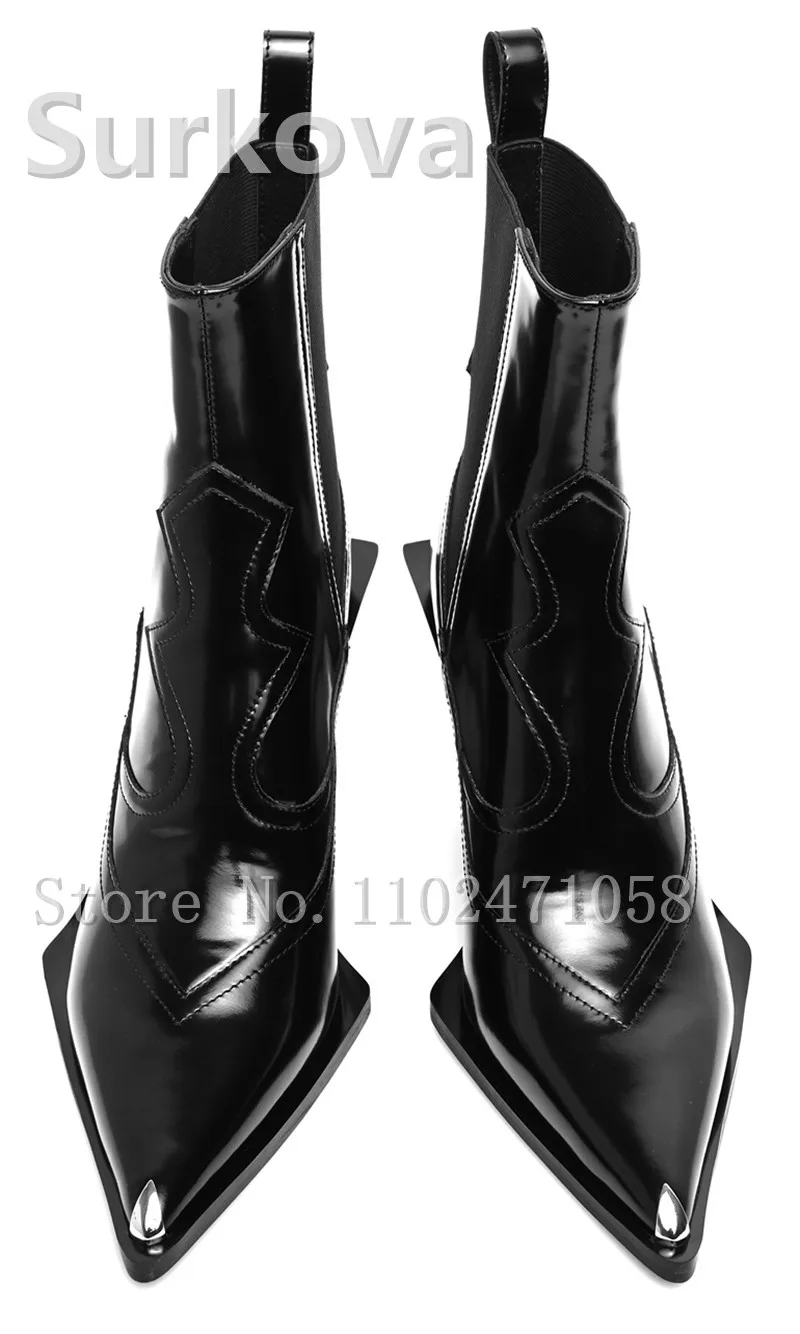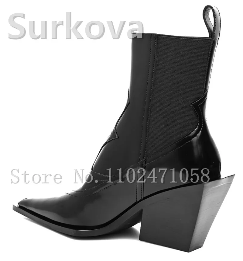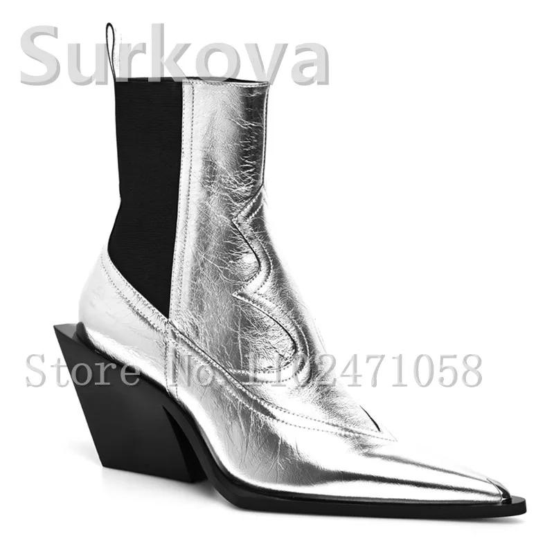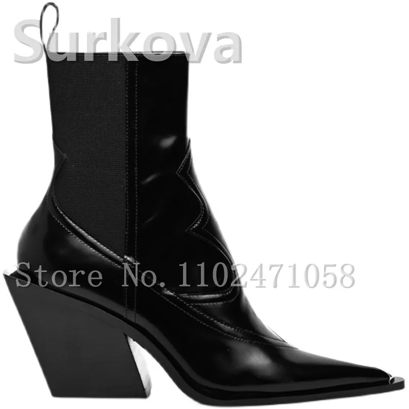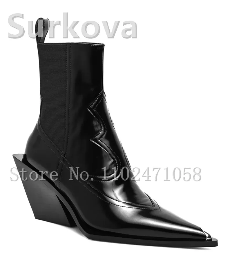 Chunky Strange Heel Women Chelsea Boots Wedge Pointed Toe Patent Leather Elastic Boots Winter Outside Ladies Ankle Short Boots