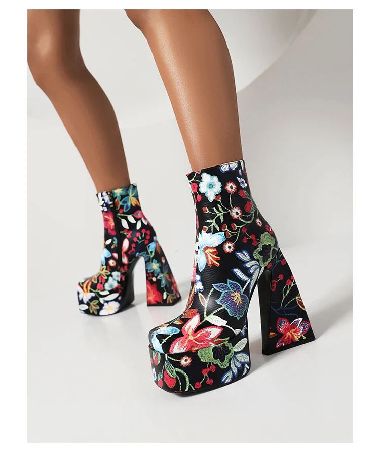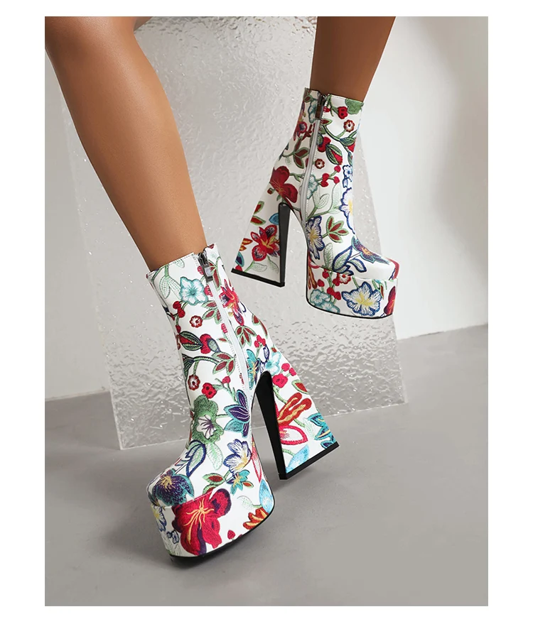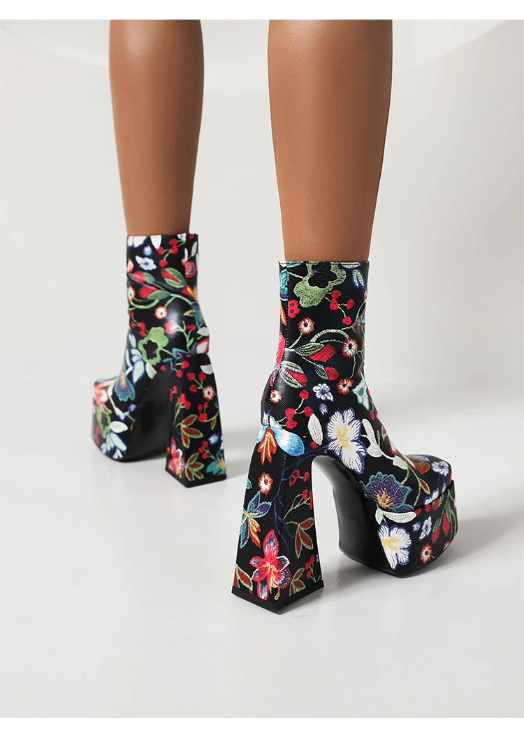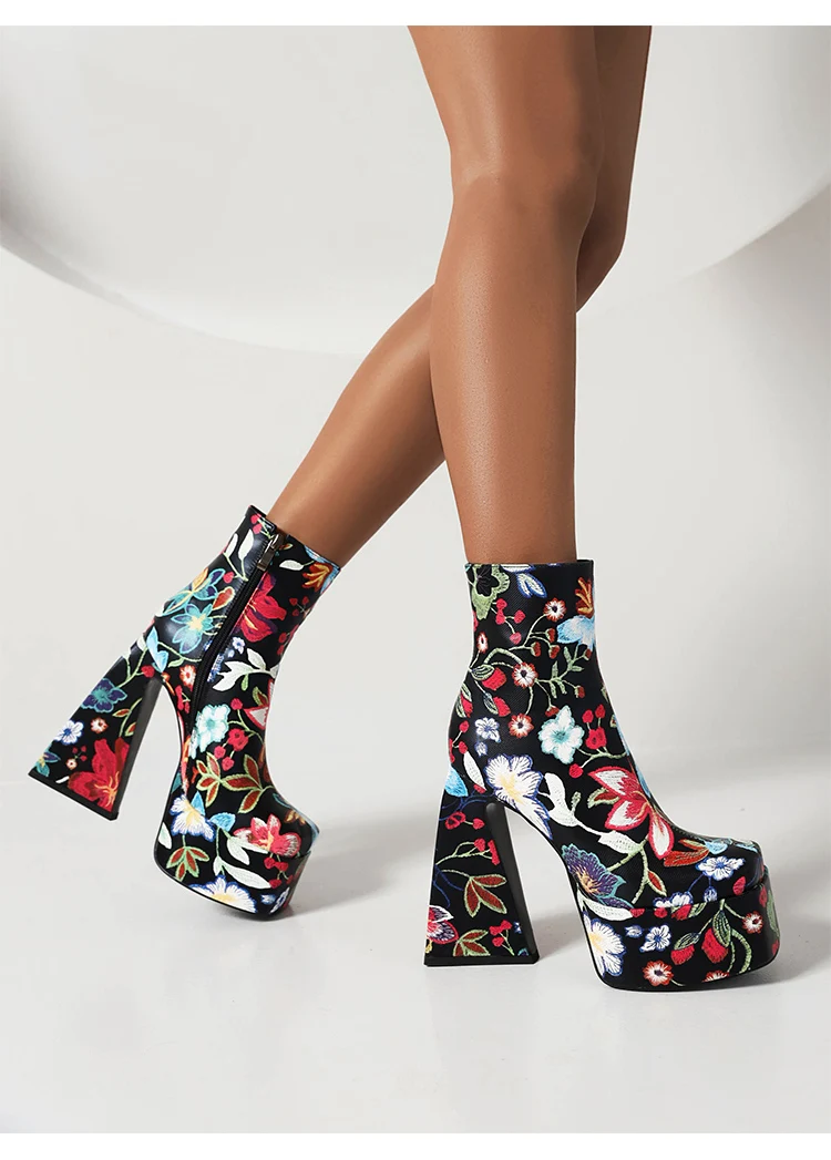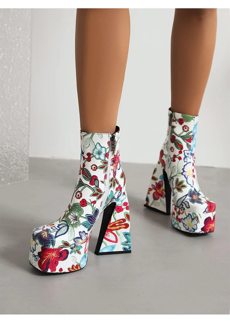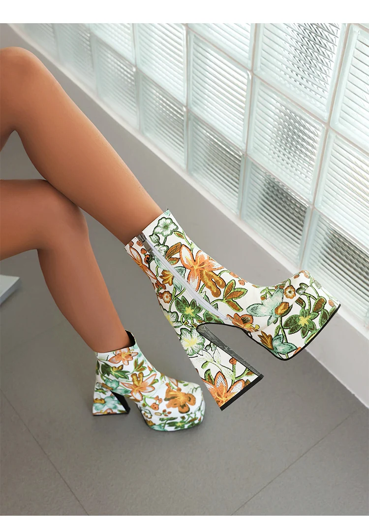 Colorful Flower Pattern Super High Cutout Chunky Heel Women’s Ankle Boots Square Toe Platform Side Zip Printed Short Boots