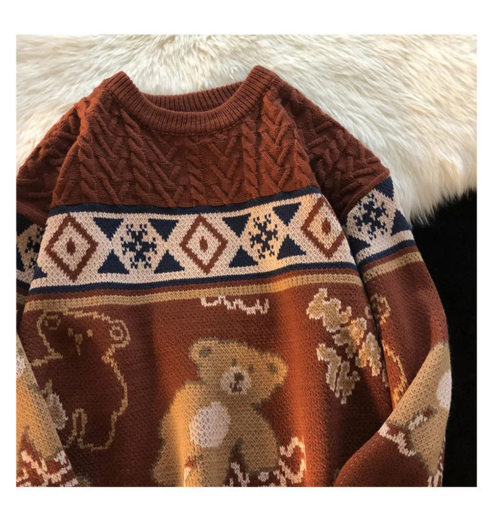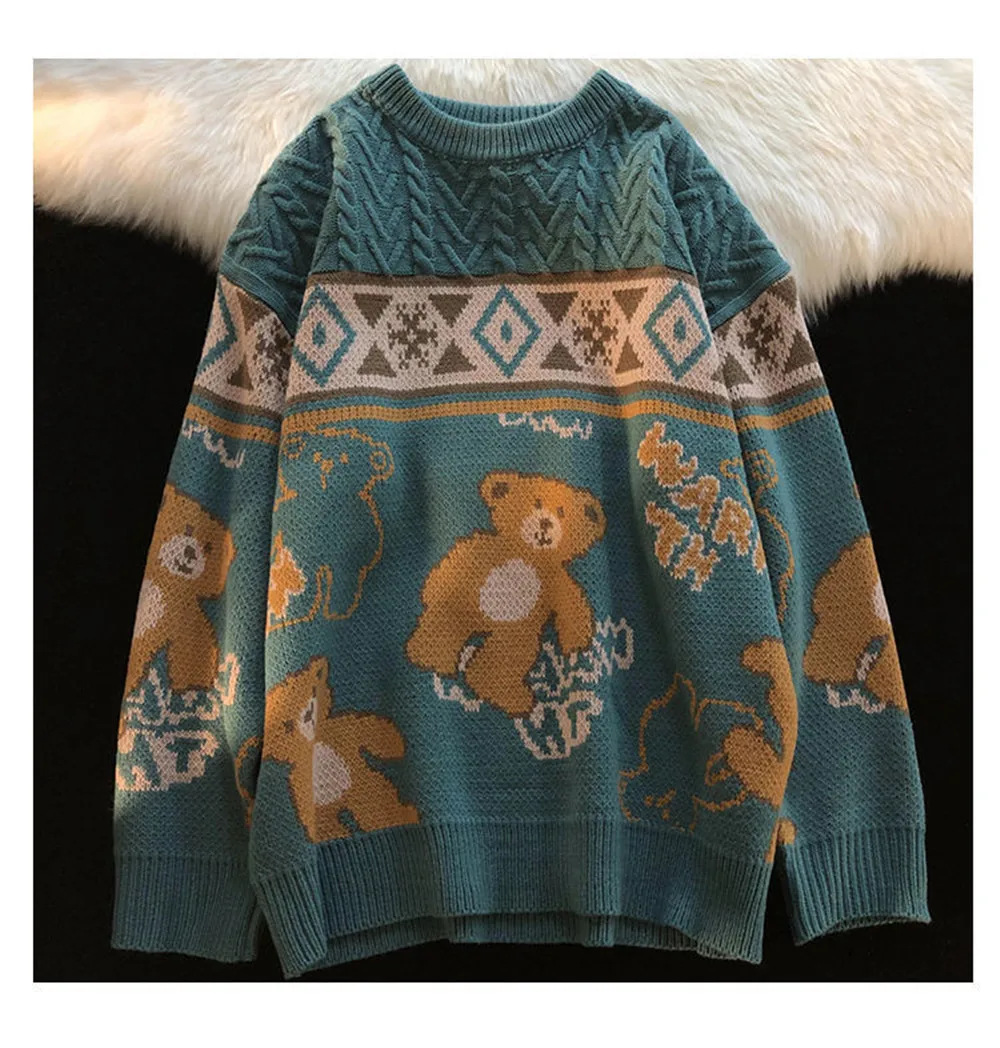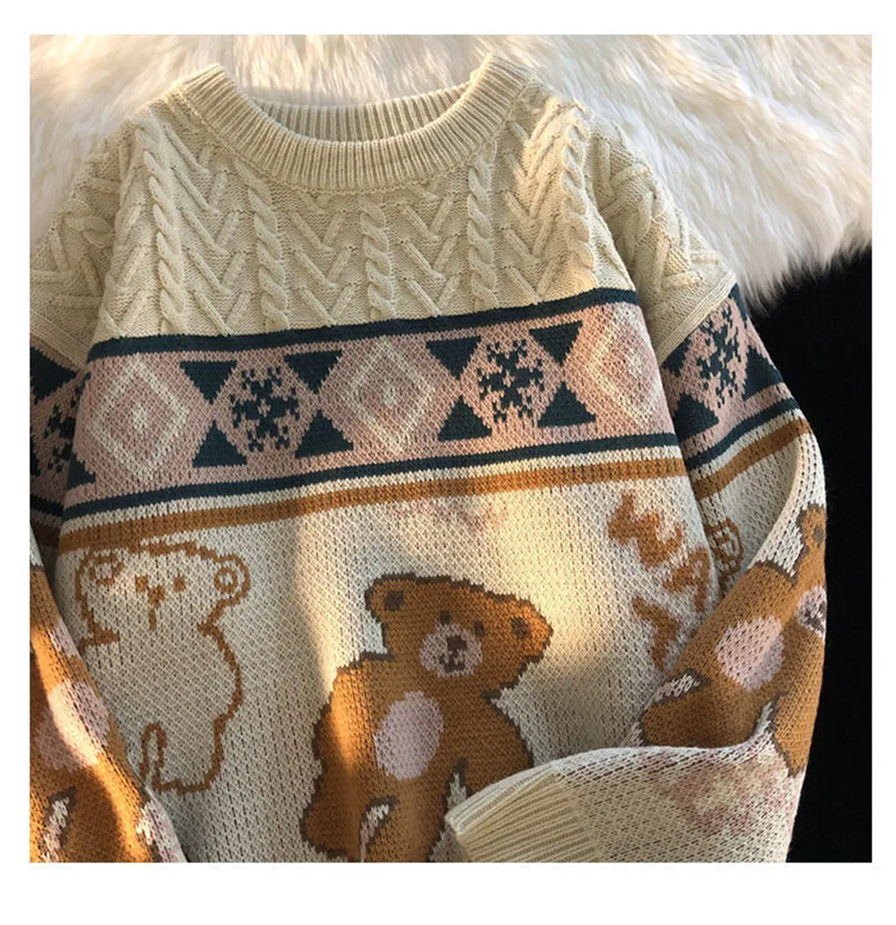 Cute Bear Tops Oversize Men High Street Knitting Sweater Tops Autumn Pullover Loose Harajuku Kawaii White Women Couple Sweaters