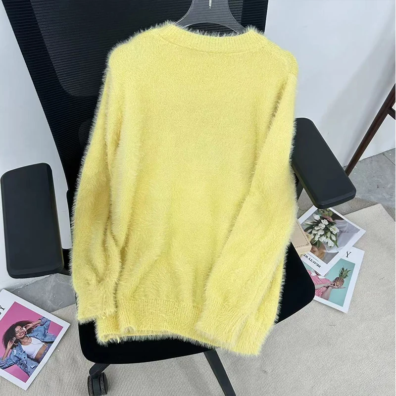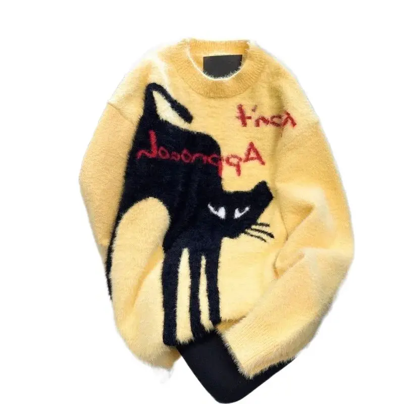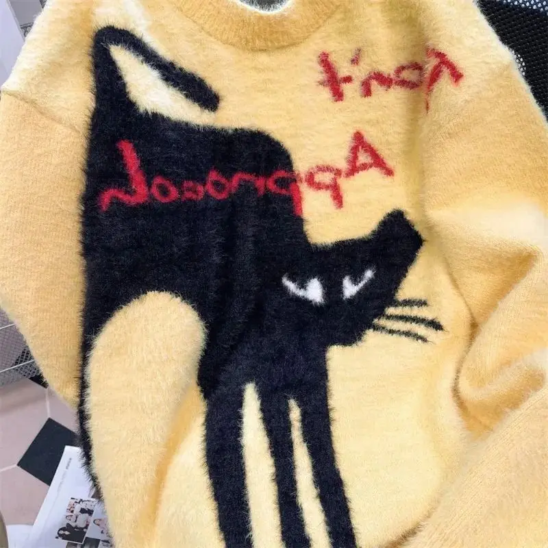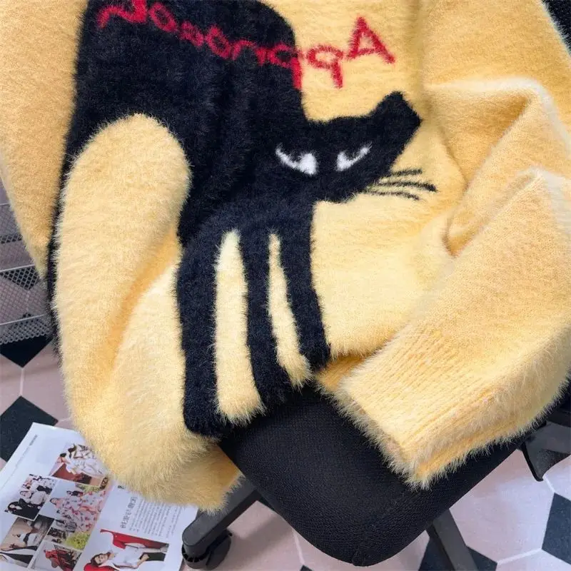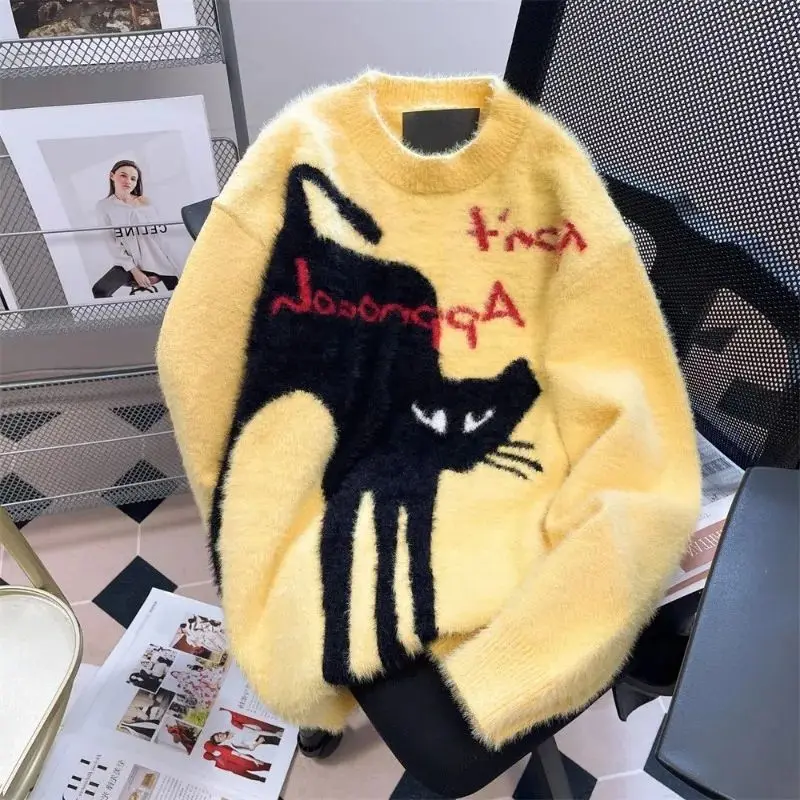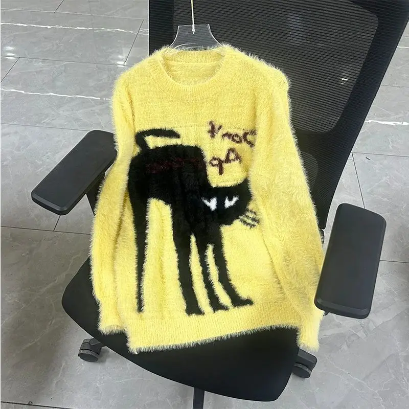 DAYIFUN Yellow Sweaters Women Autumn Mink Plush Cat Pattern Knit Pullovers Winter Long Sleeve Oversize O Neck Loose Lady Jumpers