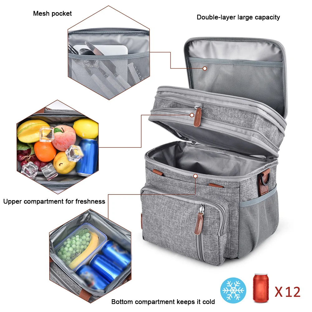 Double Deck Cooler Bag Expandable Lunch Tote Bag Insulated Thermal Lunchbox with Shoulder Strap for Work Office Camping Travel