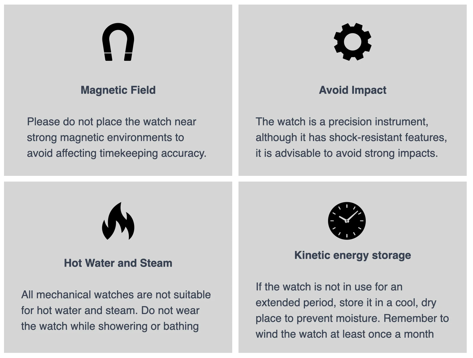 Avoiding Magnetic Fields: The magnetic components inside mechanical watches are highly sensitive to magnetic fields, so it is advisable to avoid placing the watch near strong magnetic sources such as televisions and audio equipment.