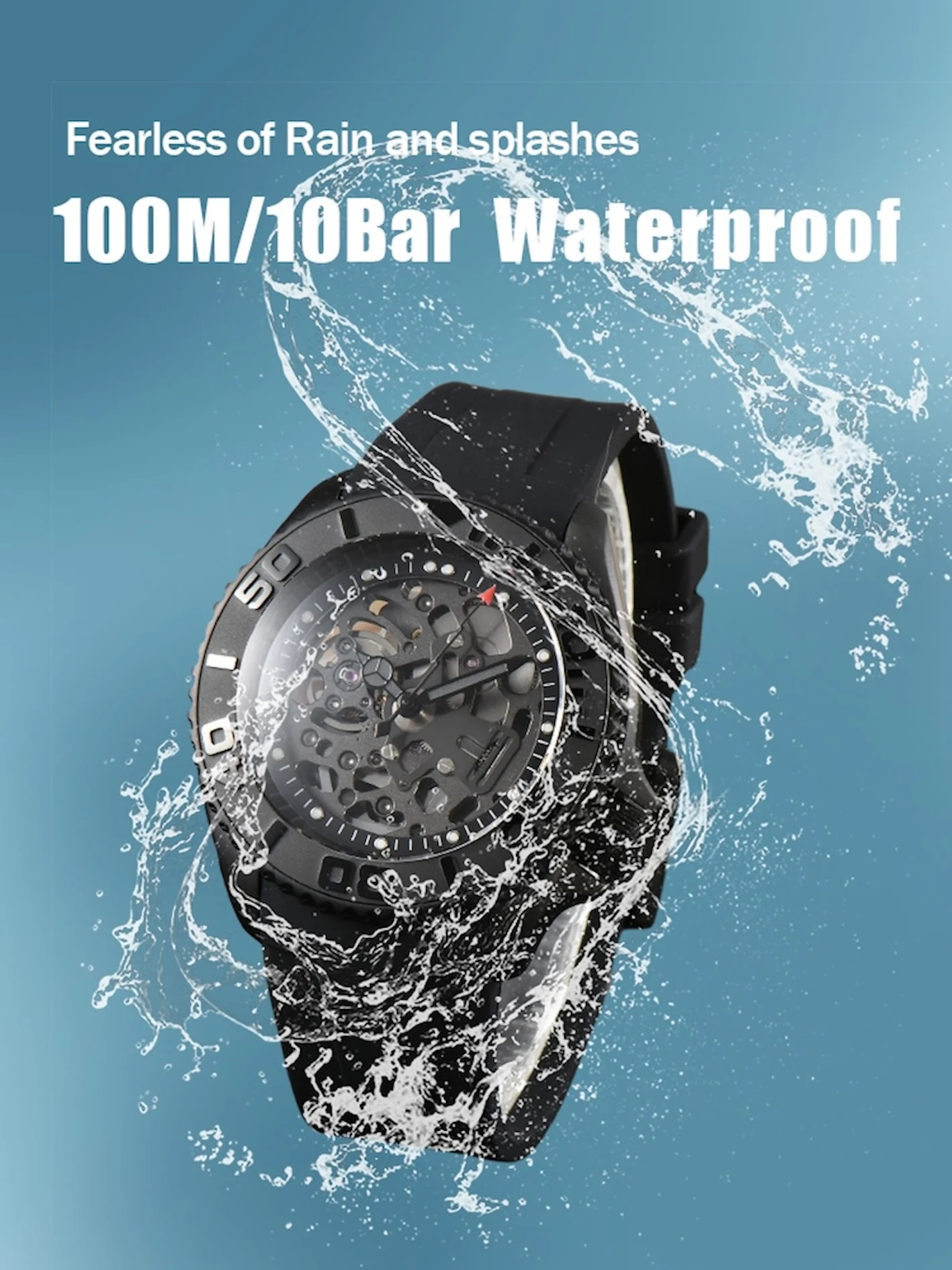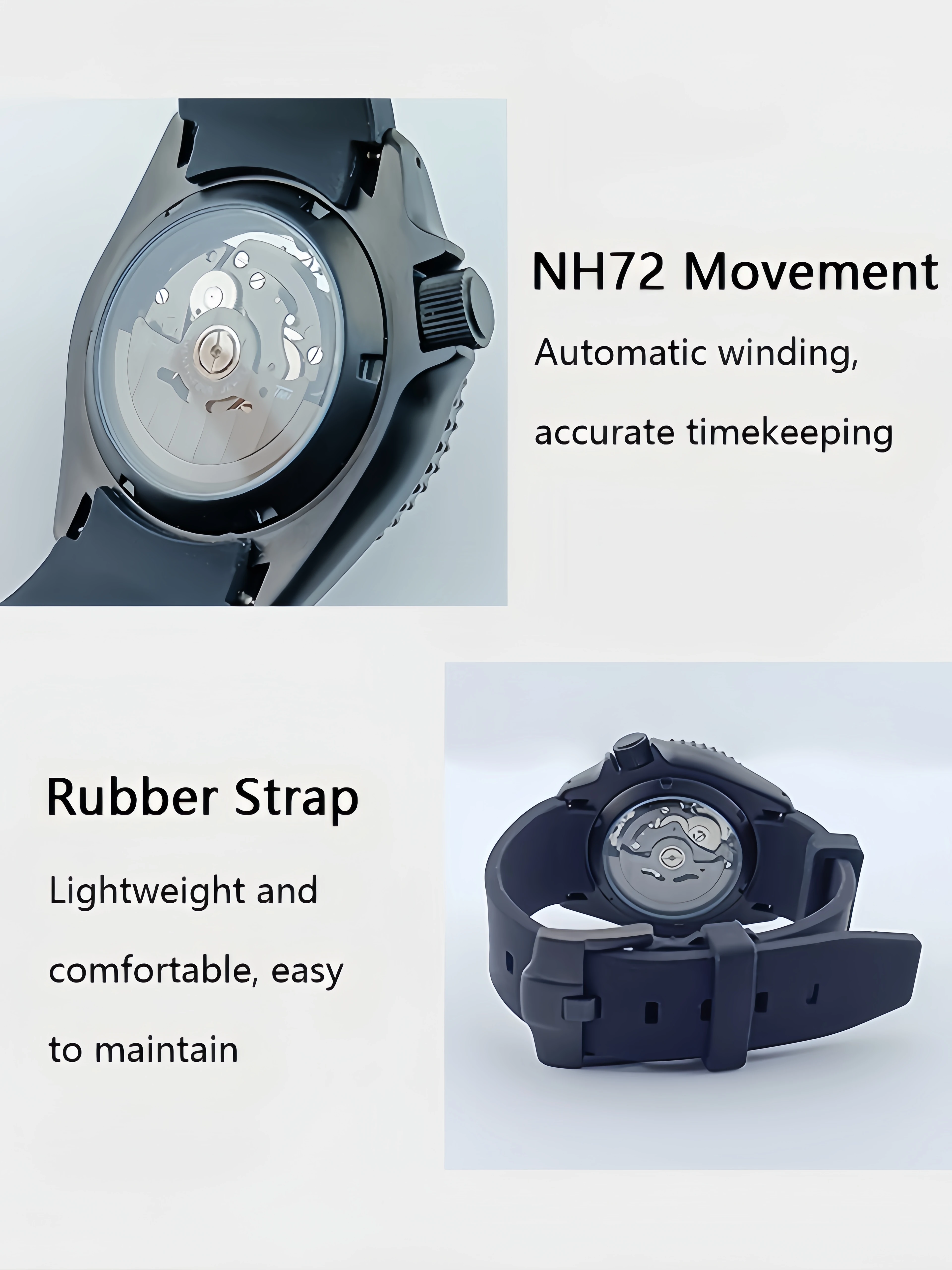 Rubber Strap:Combining comfort, durability, and style, this mechanical watch features a lightweight, versatile rubber strap that’s perfect for both active and casual wear, with easy maintenance.