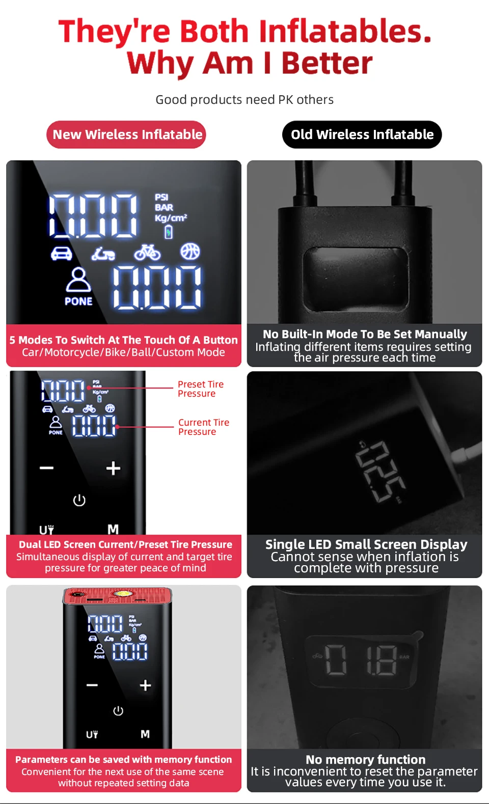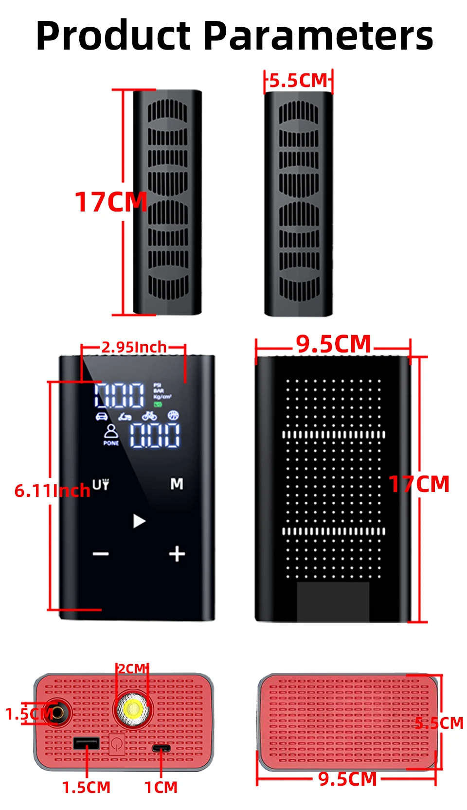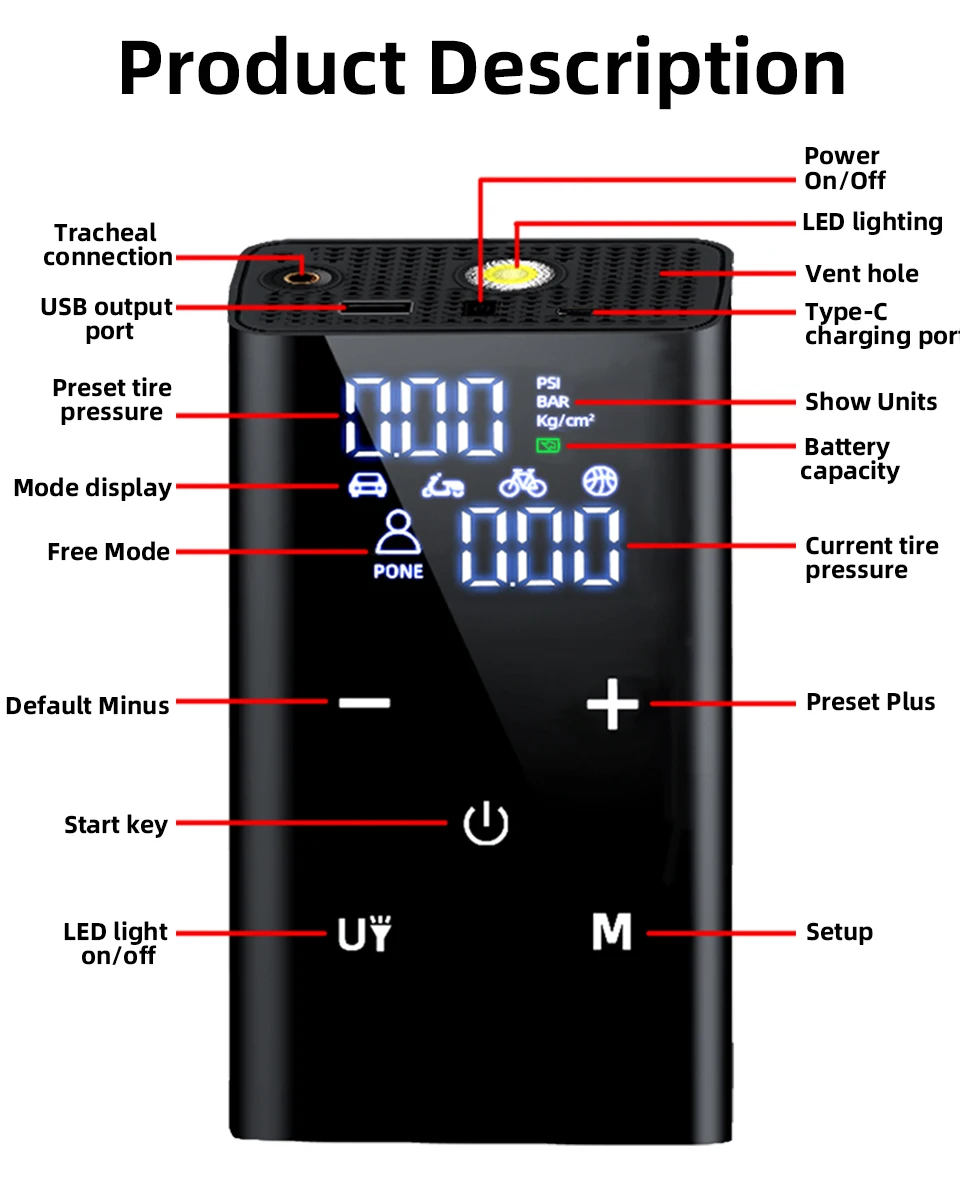 ●Portable and easy to operate: The wireless design and small mini size make the air compressor portable and easy to operate with one hand, weighing only 0.61Kg. Five independent buttons, easy to operate. 5 modes, choose according to the type of inflation you need. The liquid crystal display shows the air pressure, which is very intuitive. It is suitable for inflating tires when the tires are insufficient.