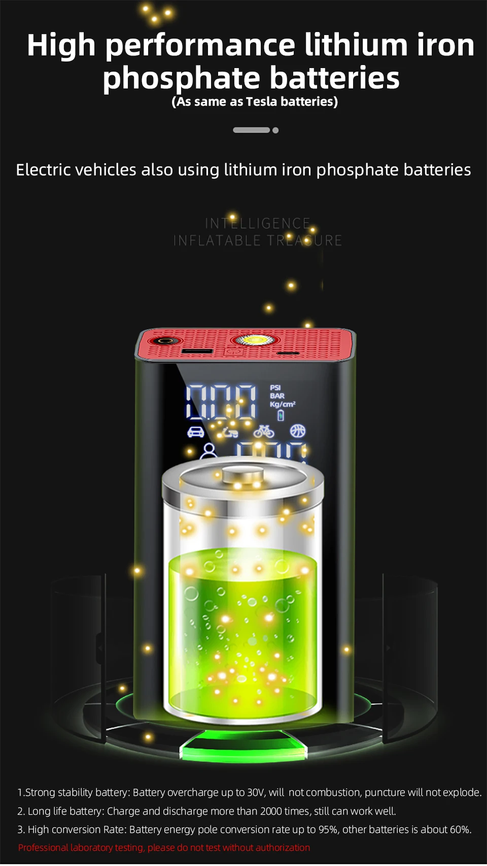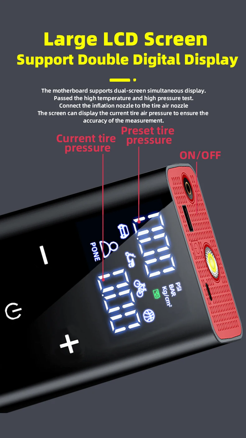 ●Large-capacity rechargeable battery: This portable compressor is equipped with four 2000mAh certified lithium-ion batteries, which can charge bicycles, balls,motorcycle etc. at any time.