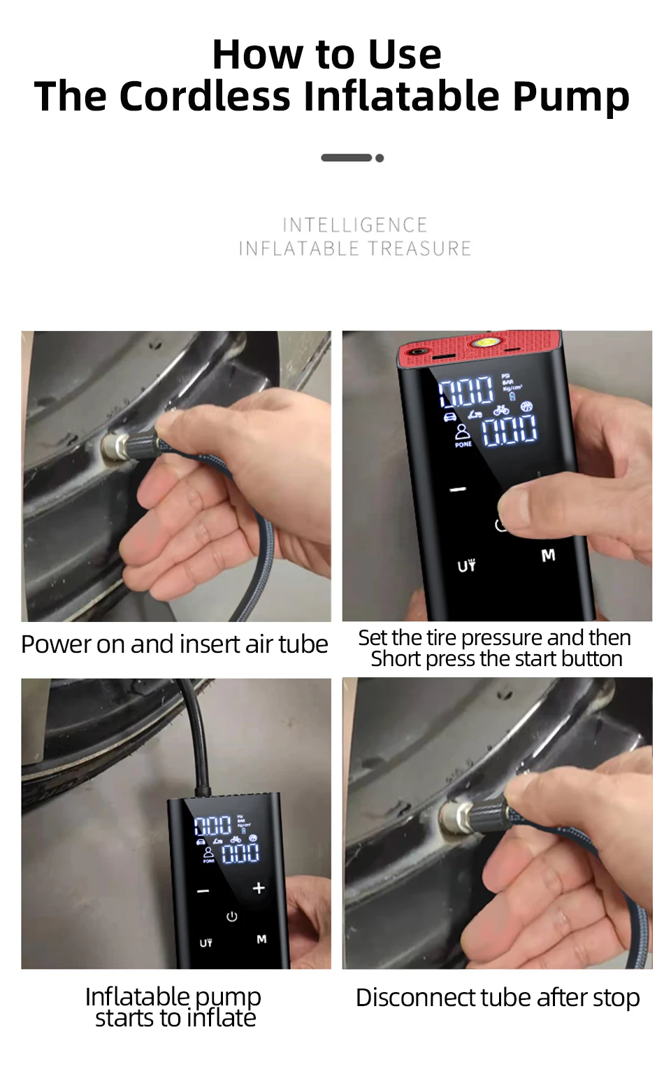 ●Multifunctional: This air compressor is equipped with 4 nozzle adapters. It can be inflated next to the tire, as well as balls, air cushions, and toys.