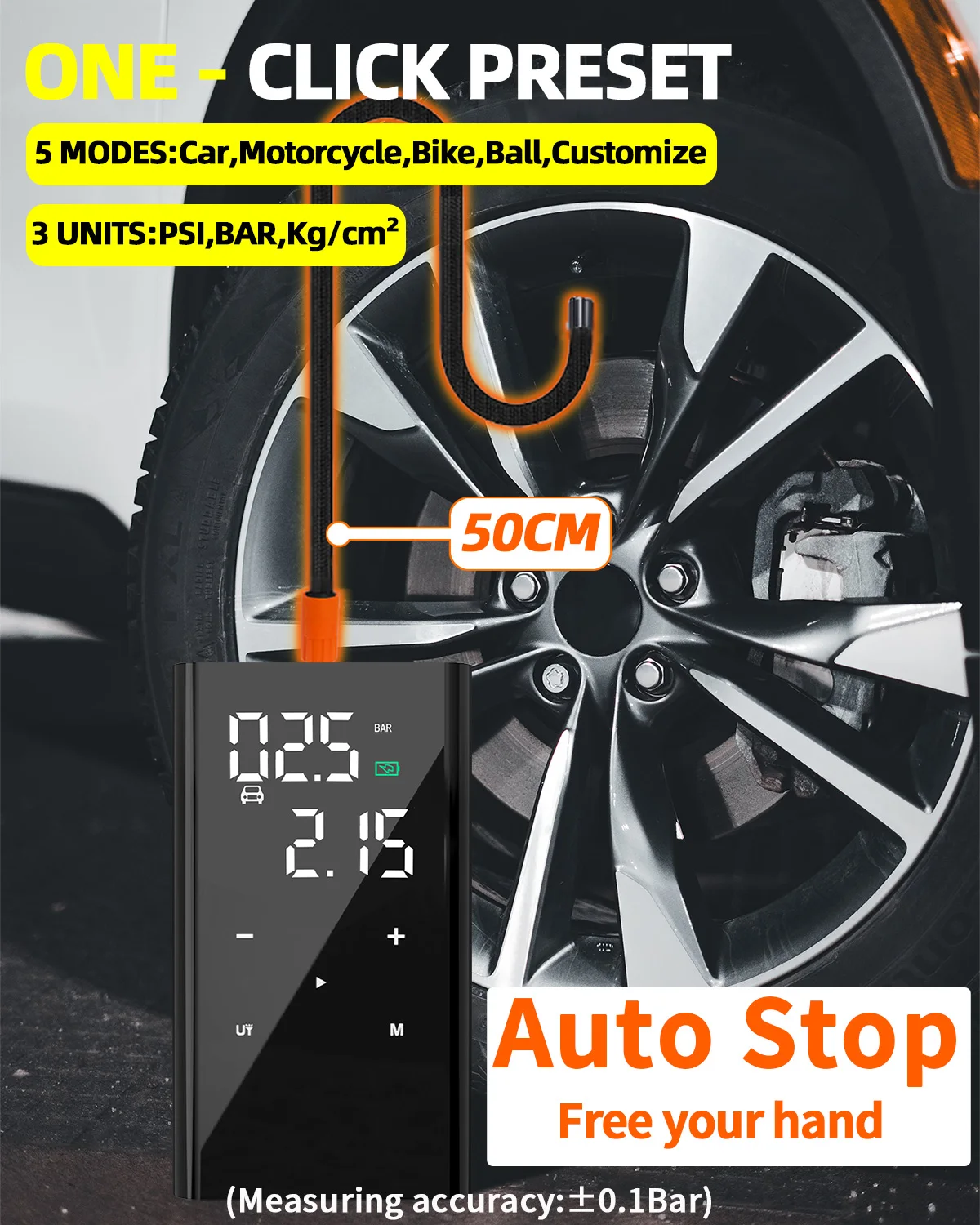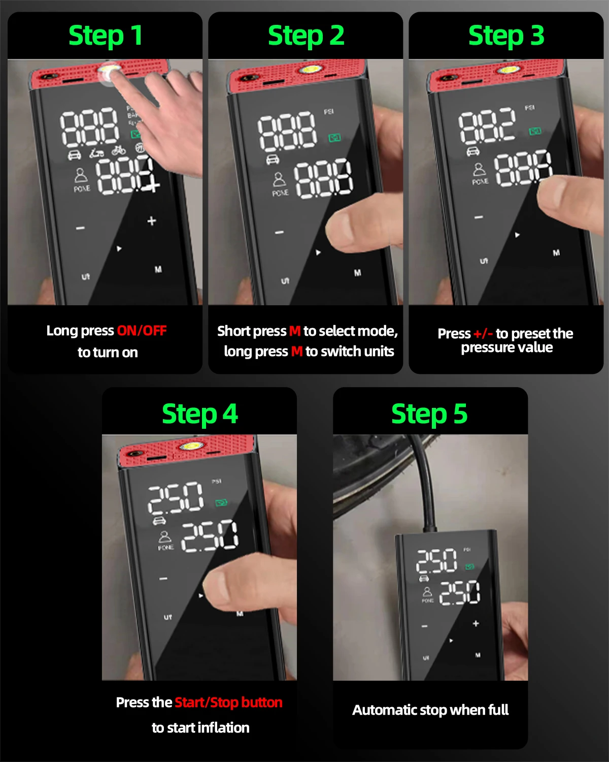●Fast and automatic inflation: The electric air pump has 3 switchable pressure units (PSI, BAR, KG/CM²), so you can set the tire pressure according to your needs. When the set tire pressure is reached, the compressor automatically shuts off. The maximum pressure is approximately 150 PSI.