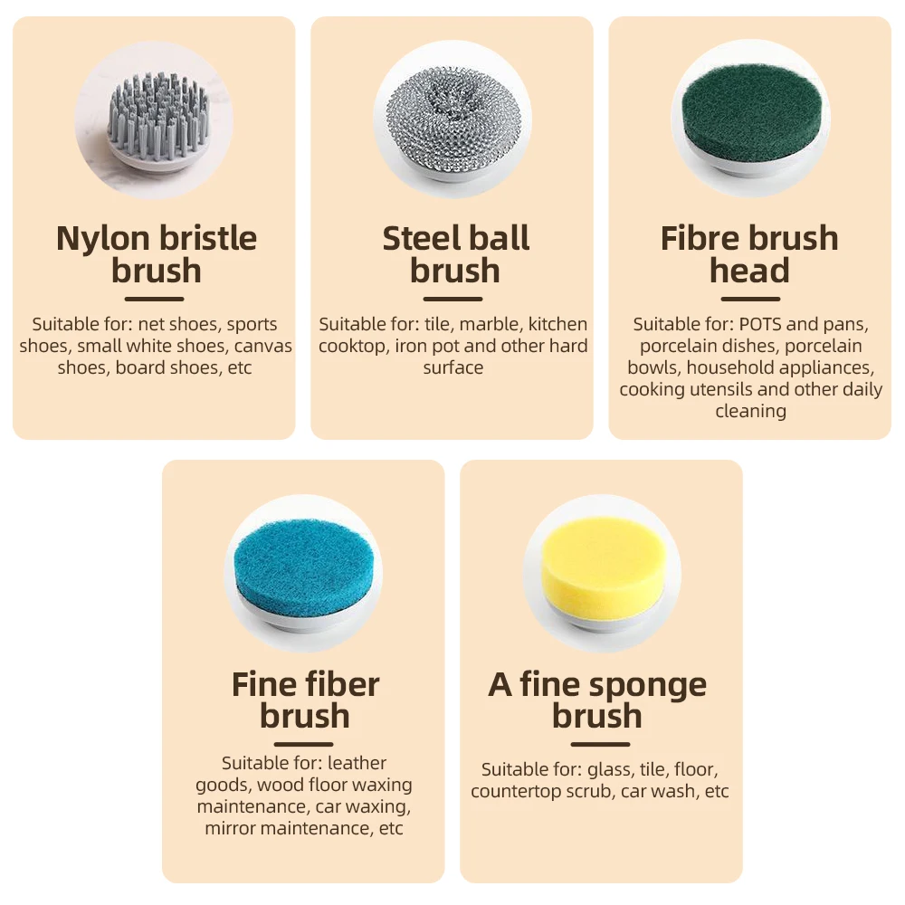 【Multiple Interchangeable Brush Heads】: Included in the package are 5 different brush heads to cater to different cleaning needs. From a fiber brush head for general cleaning to a nylon brush head for tougher stains, each brush head is designed to provide optimal results without causing damage to the surfaces being cleaned.