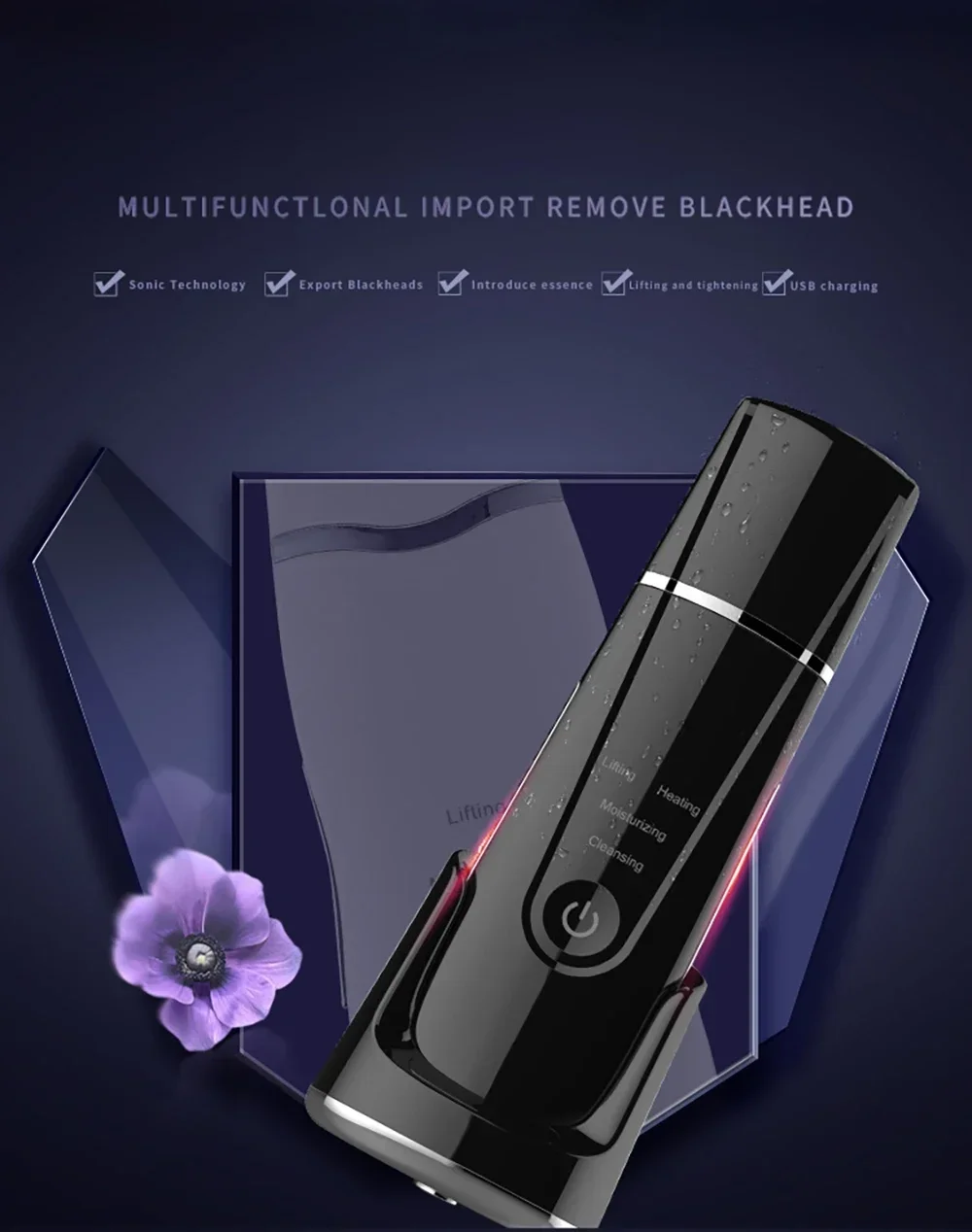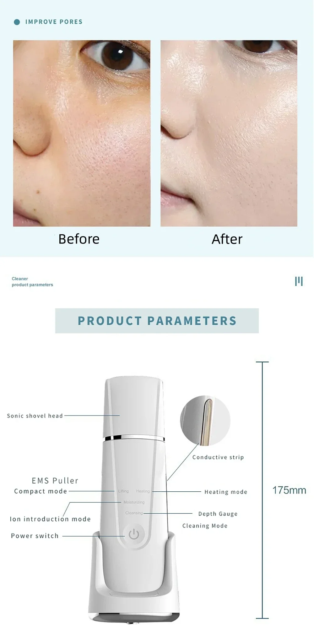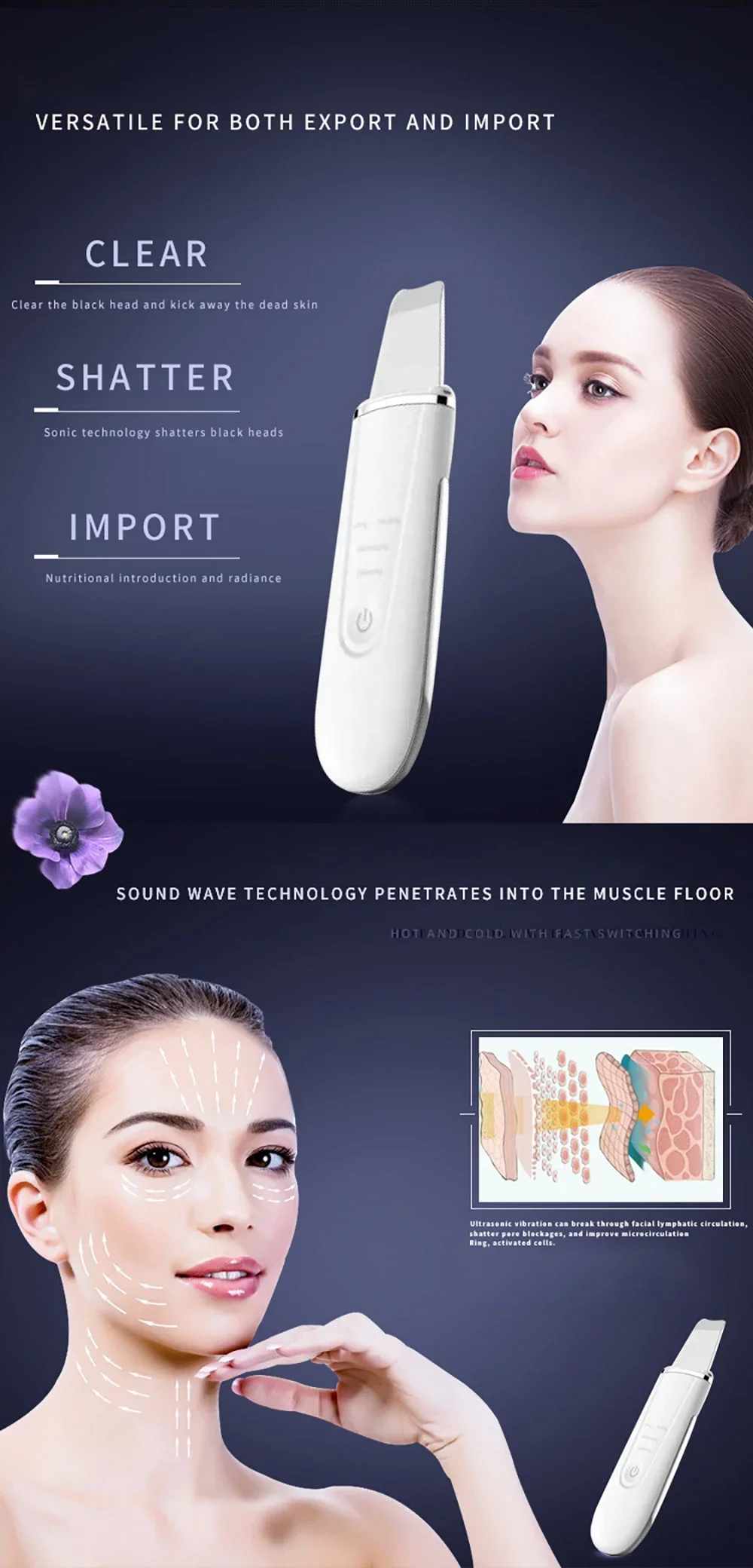 By adopting ultrasonic vibration theory and tepid effect, it can promote blood circulation inside the dermis, accelerate lymphatic return, discharge toxin which accumulated in the deeper skin and eliminate dead cell to avoid Corneous layer cells accumulation excessively, thus to make the moisture and nutrition to transfer rapidly, enhance cell’s penetrability, strengthen skin care product absorption, improve skin moisten.