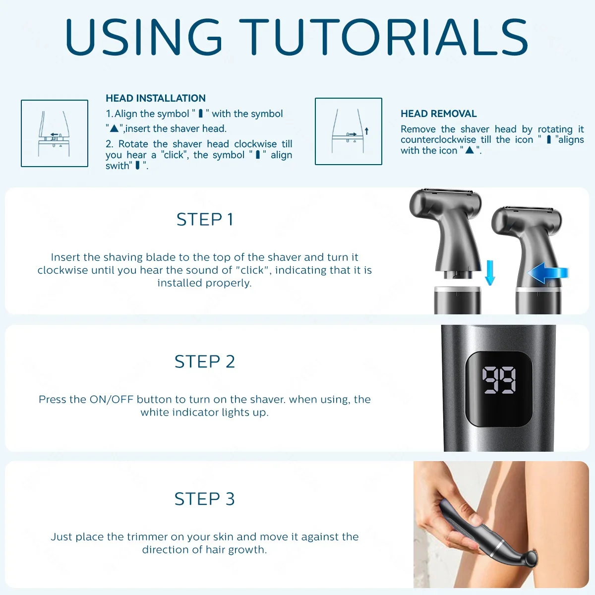 1. Professional electric shaver: Precisely trim the back, legs, underarms and arms. Suitable for home use, suitable for a variety of environments, easy for beginners to use.