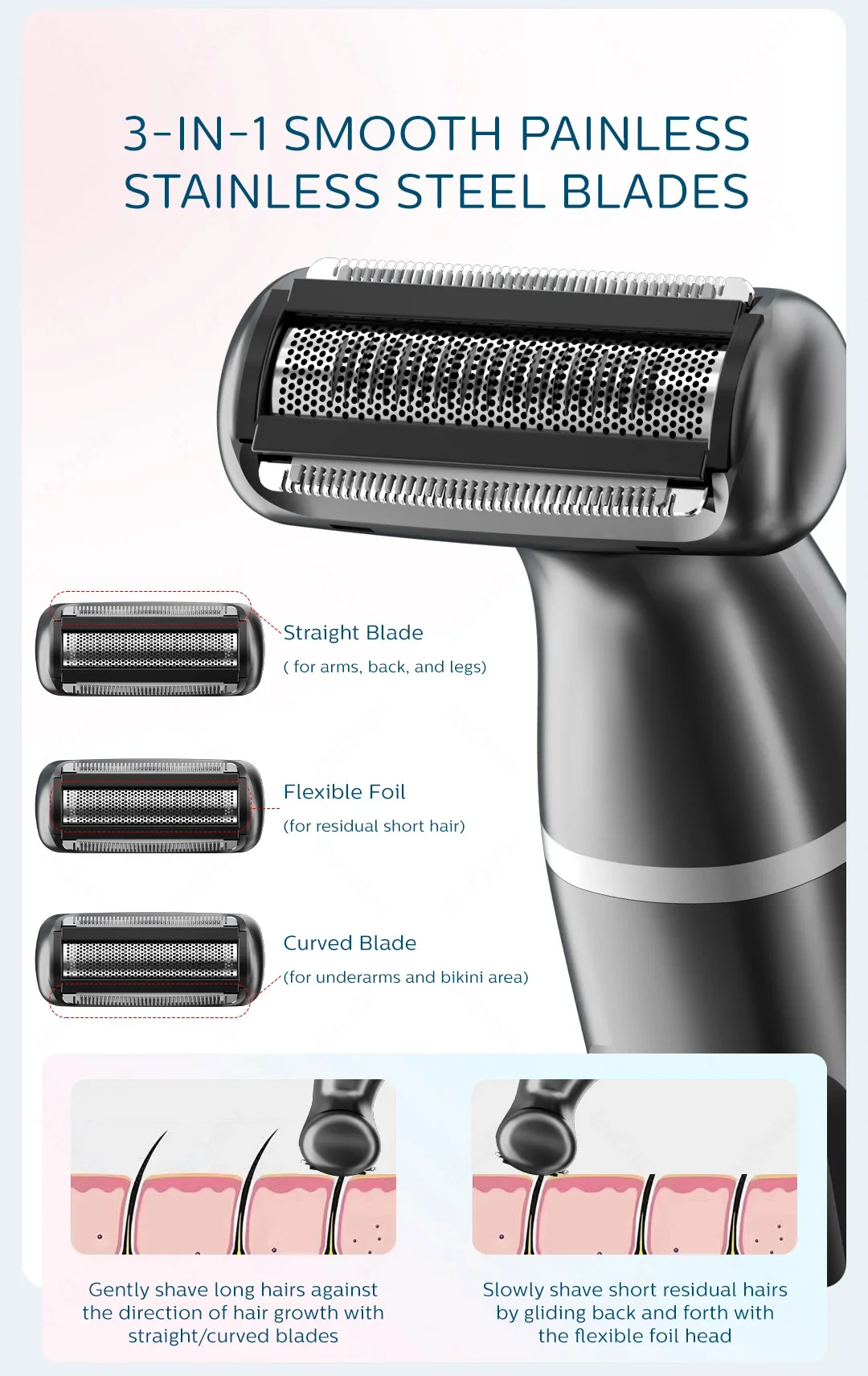 5. High-quality 3-layer flexible foil blade: It consists of three types: straight blade-flexible foil blade-curved blade, which can trim hair more smoothly and reduce irritation and scratches on the skin.