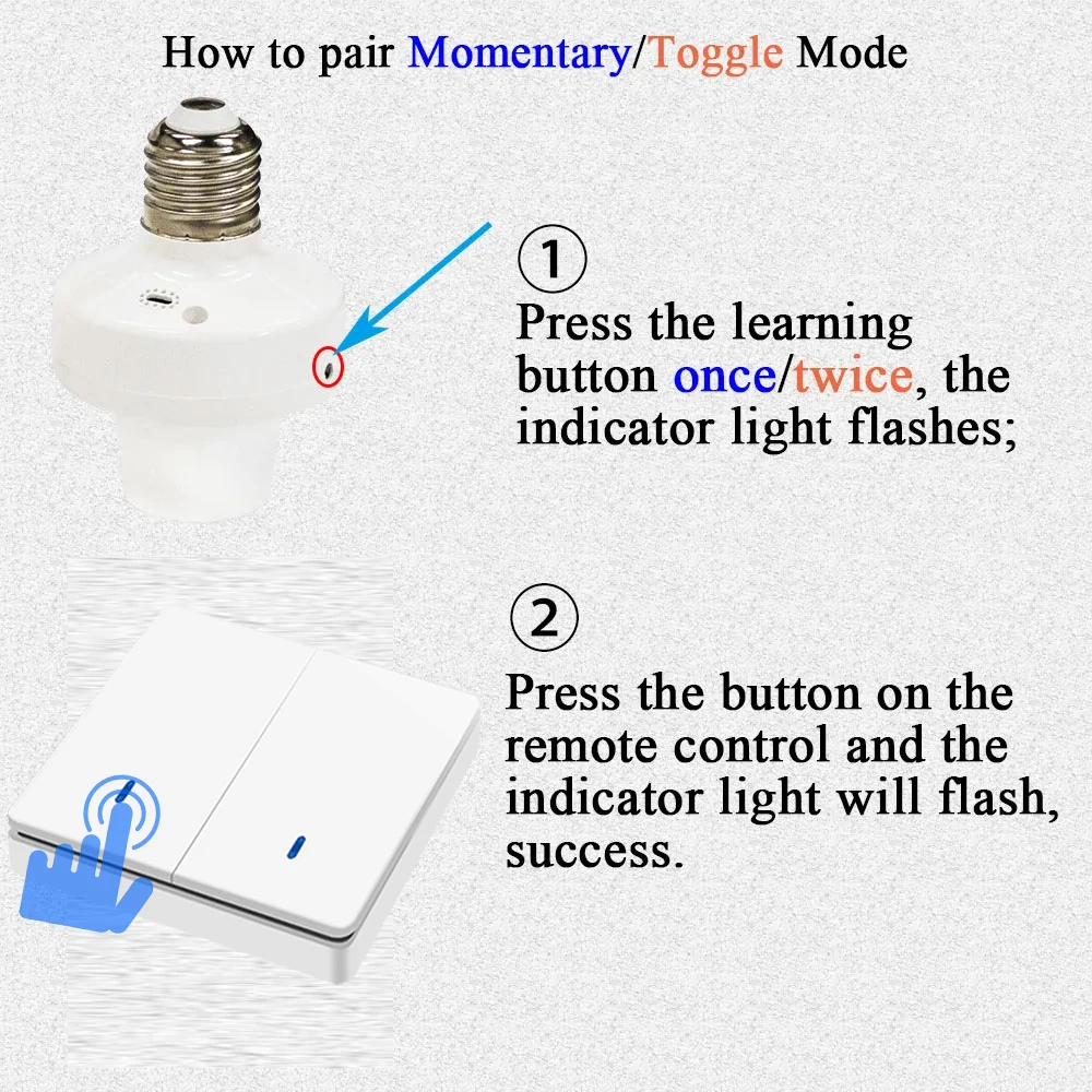Momentary mode: Press the learning button on the receiver, the indicator light flashes, press the button on the remote control again, the indicator light flashes, pairing is successful.