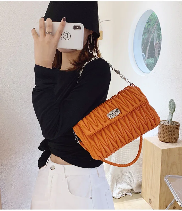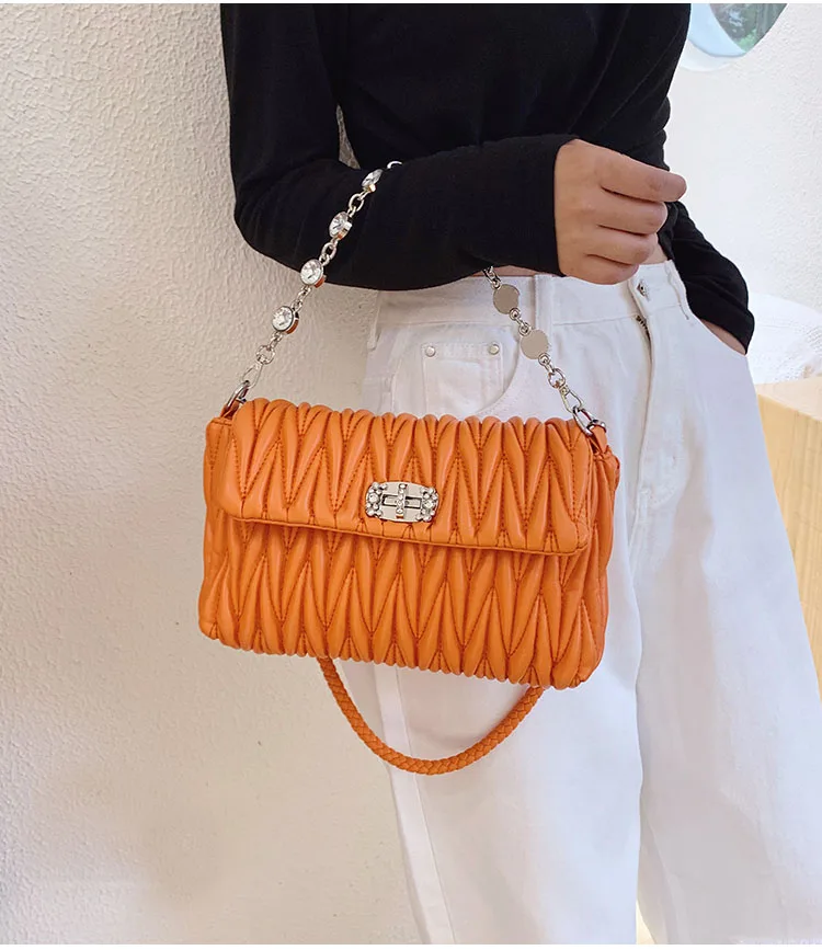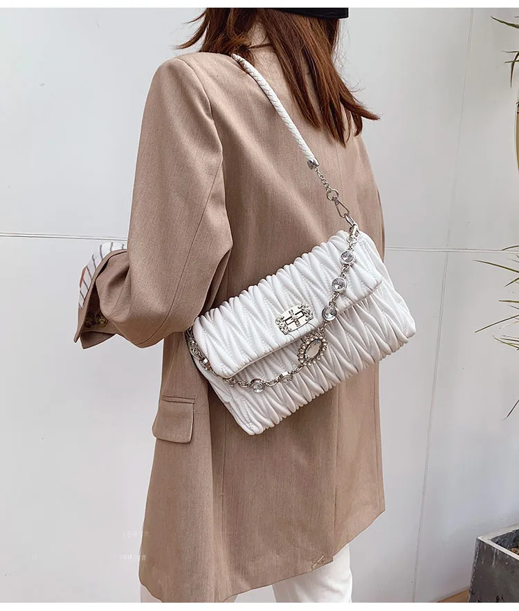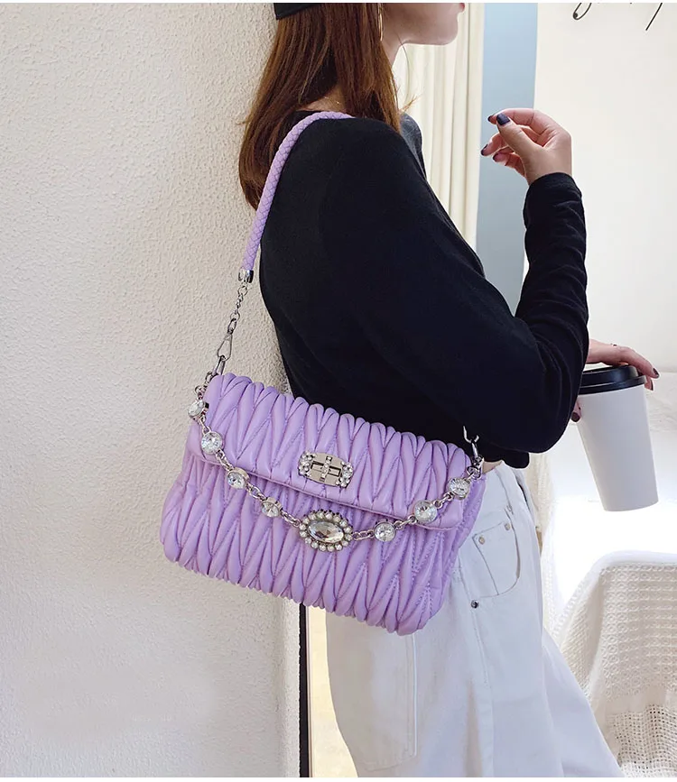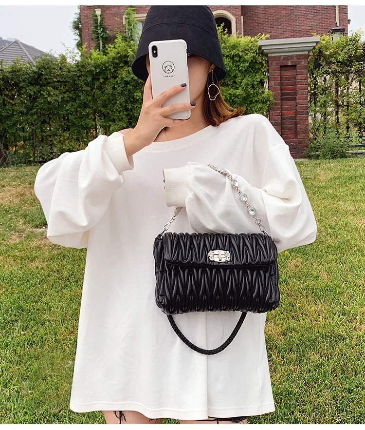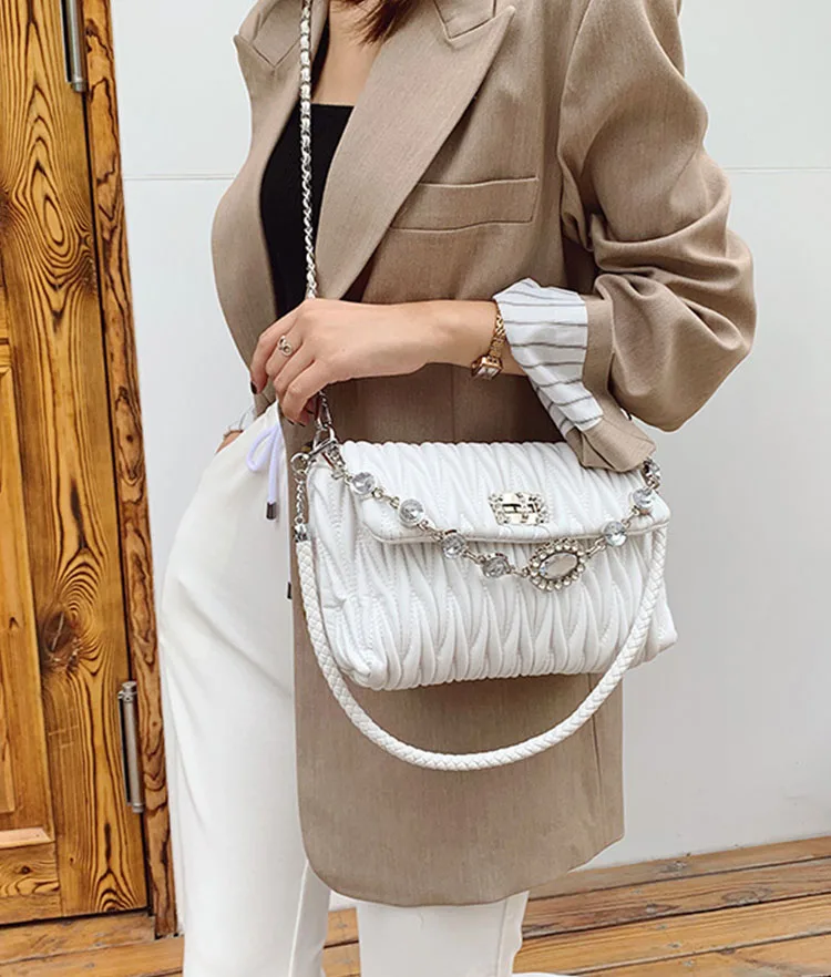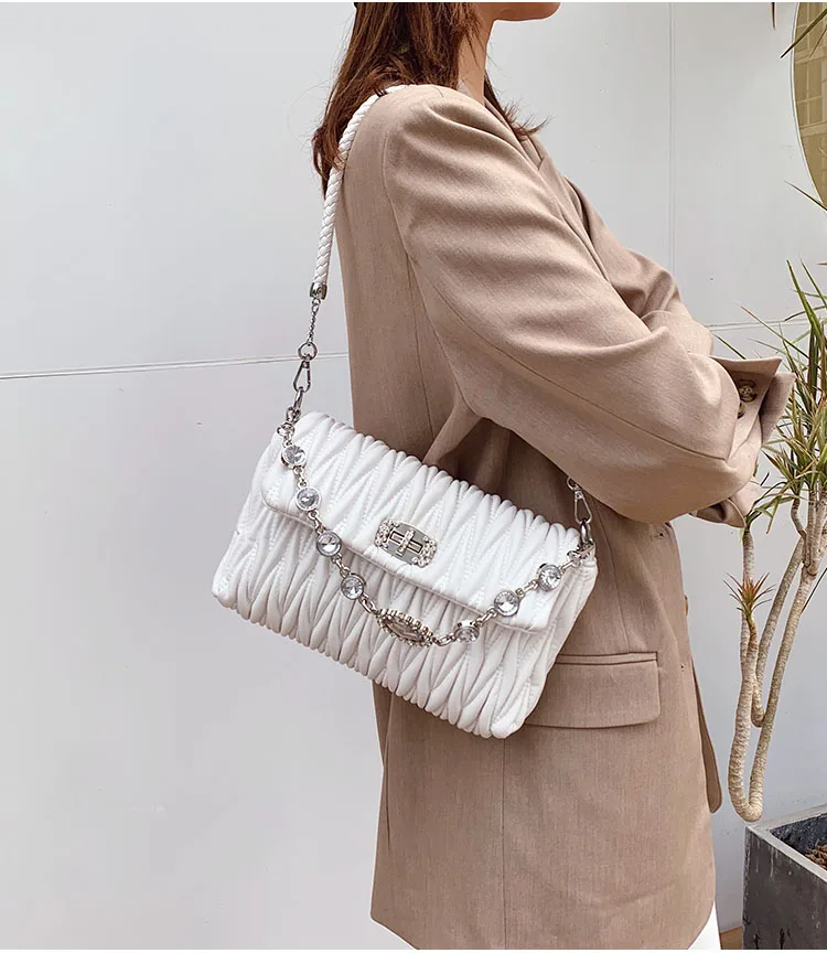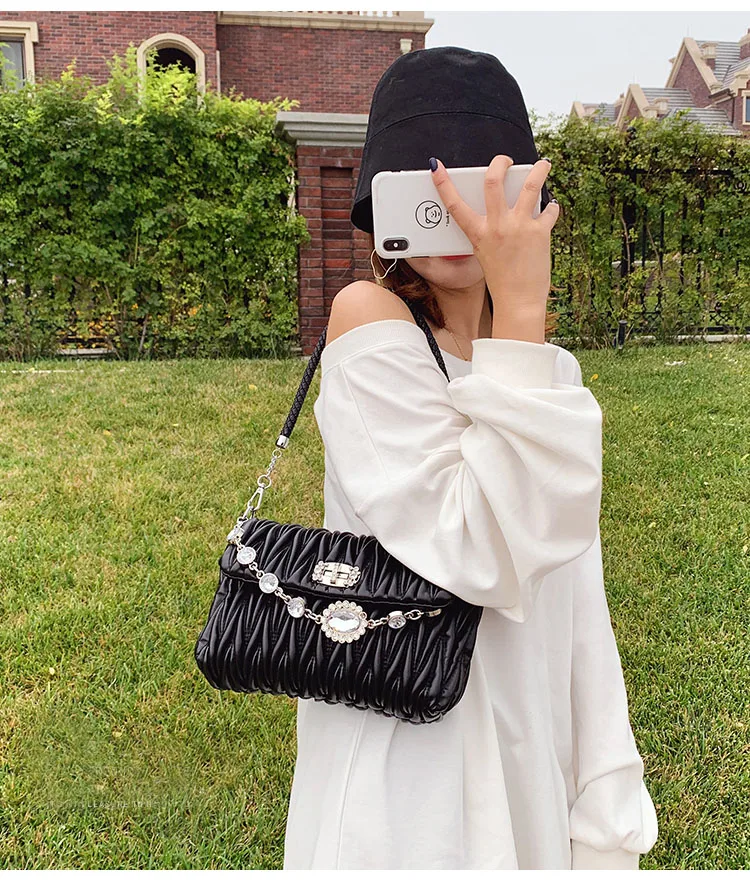 Fashion Crystals Decorated Wrinkle PU Leather Bags Quilted Shoulder Bag Women Flap Chain Crossbody Handbag