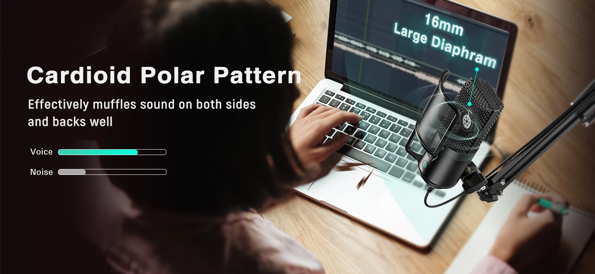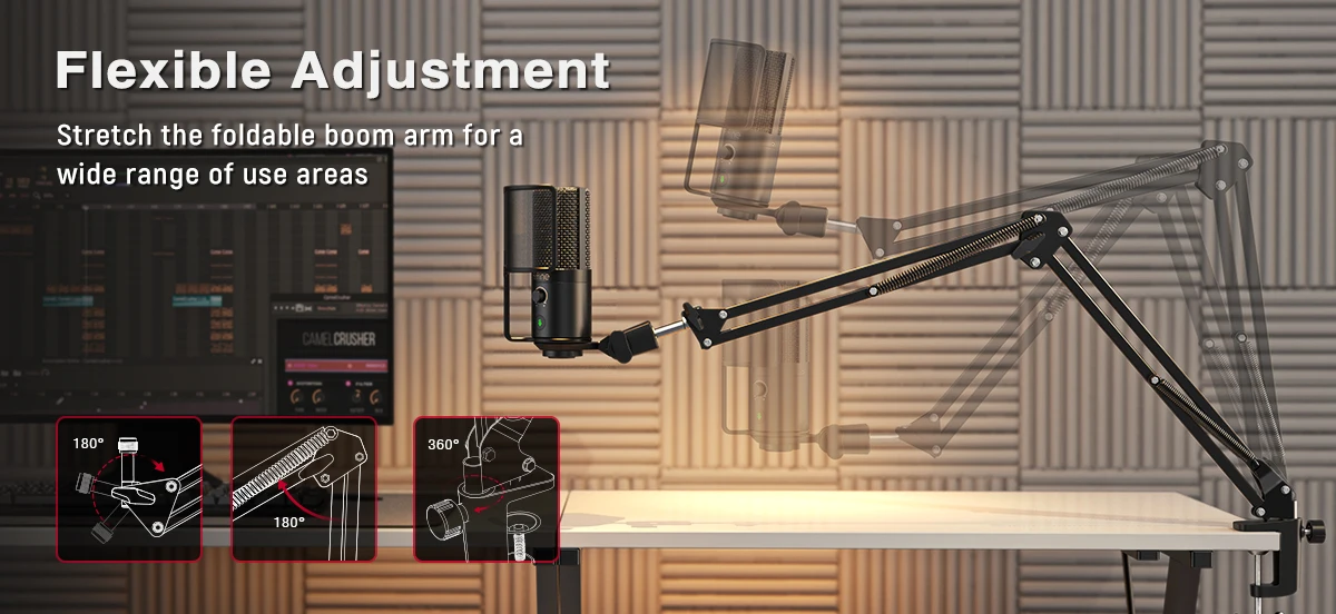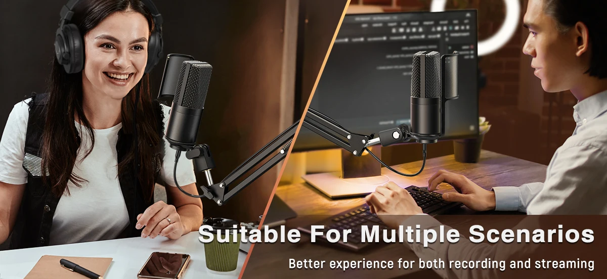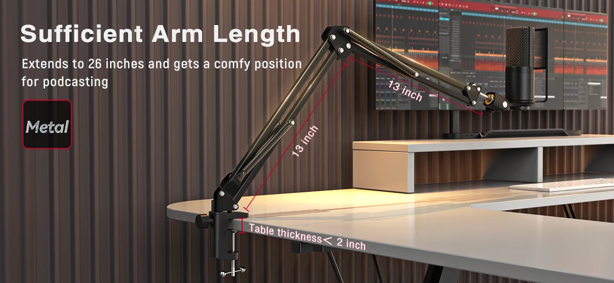 The metal streaming microphone kit securely holds the studio microphone for podcasting and isolates low frequency noise from the desktop or computer. Plenty adjustable boom arm is easily extended to 26 inches for placing the music singing microphone where you need it.
