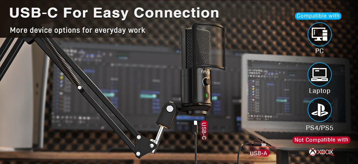Usnig USB cable to connect to PC directly to your desktop/laptop/Mac, no need for plug-ins or other devices. You can start working right away, easier to use with recording or voice software.
