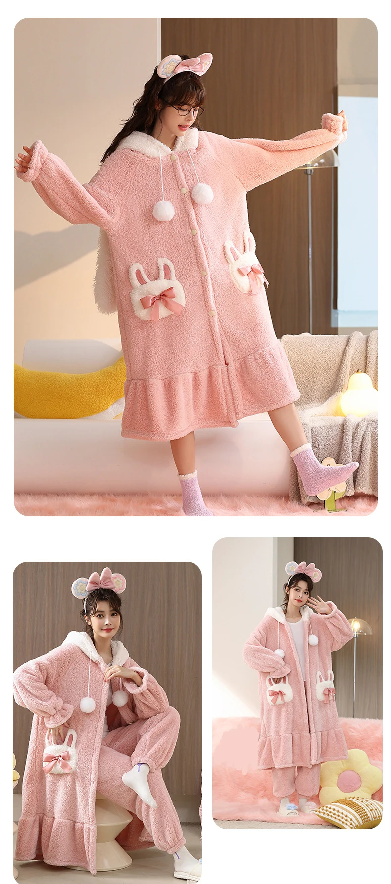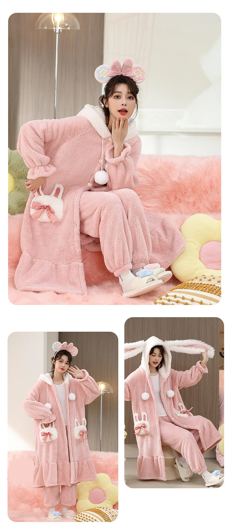 Fluffy Long-eared Hooded Nightgown With Trousers 2 Piece Set Winter Flannel Thickened Warm Pajamas Set Pink Cute Cartoon Robes