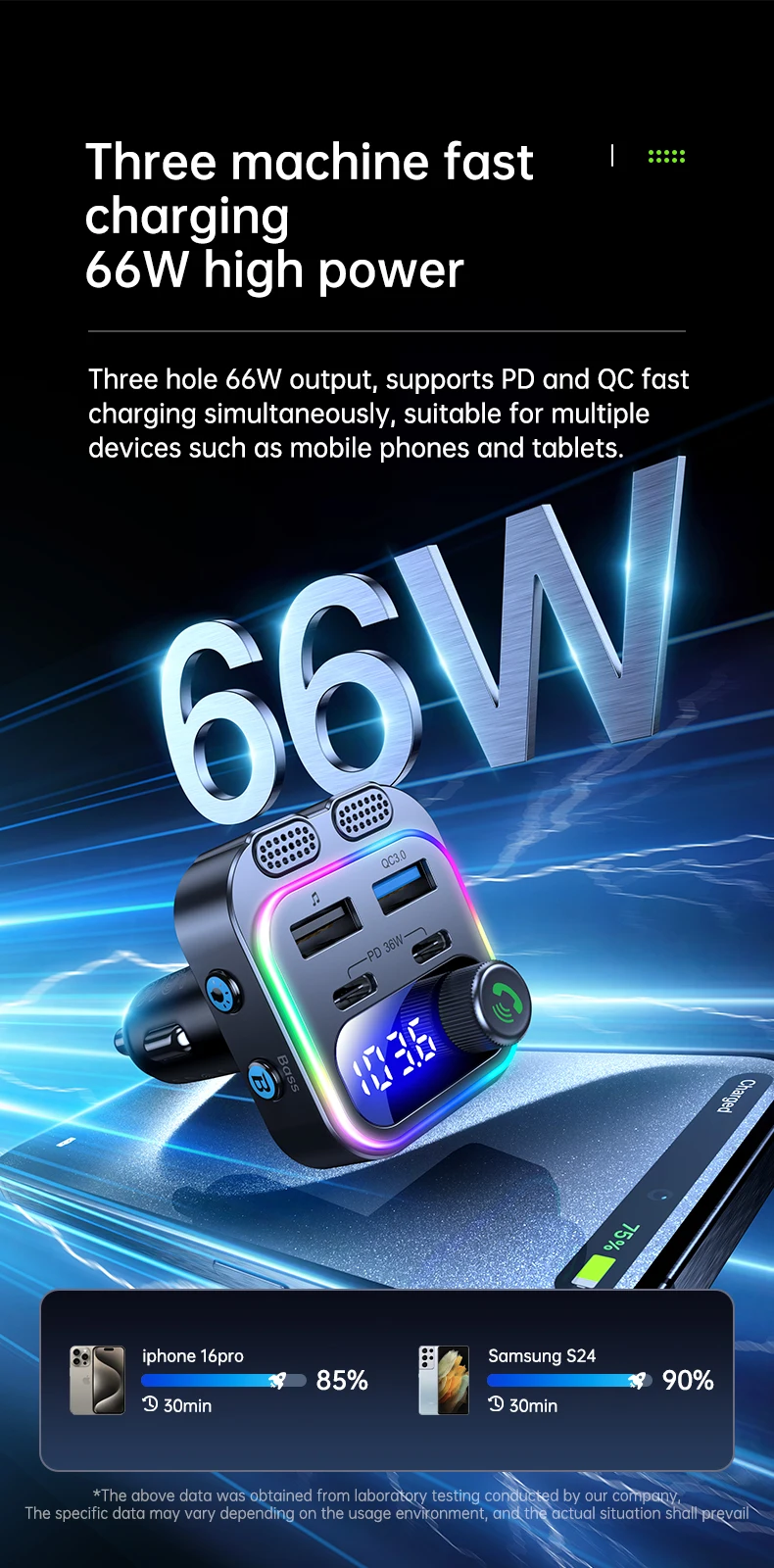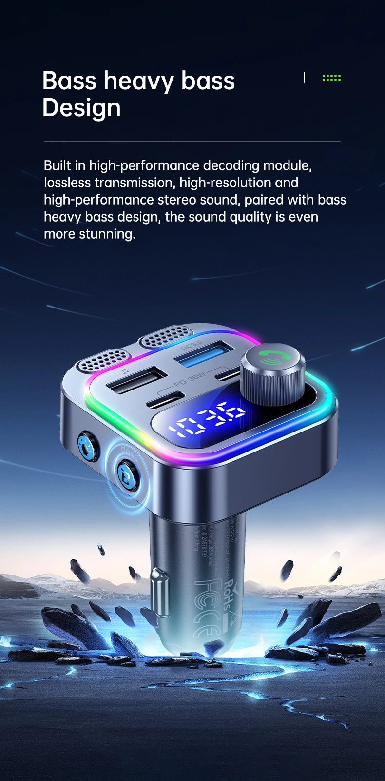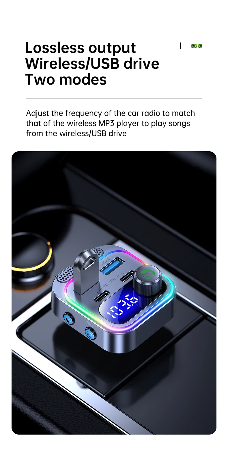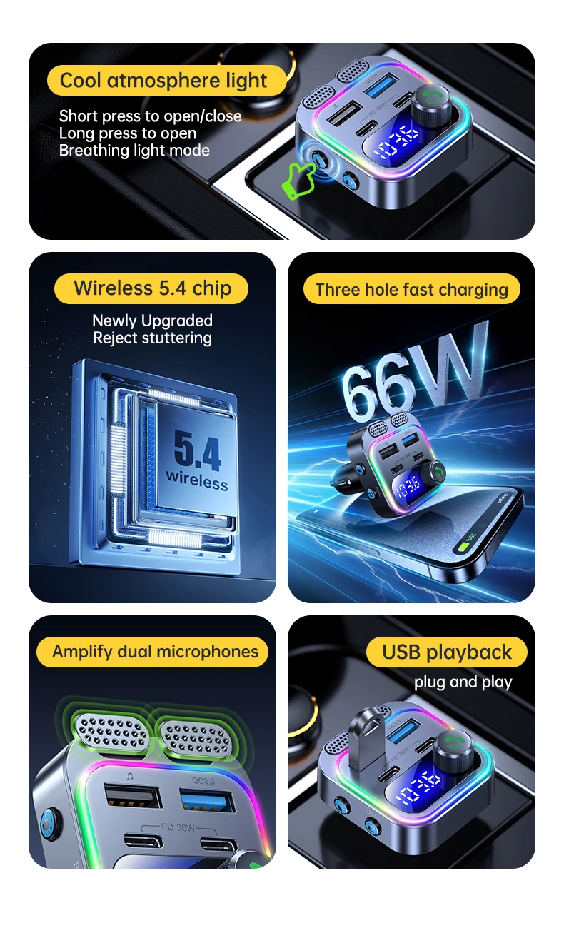 FM transmitter Bluetooth 5.4 dual microphone calling car MP3 U disk music player 66W USB car charging 66W fast charging PD36W