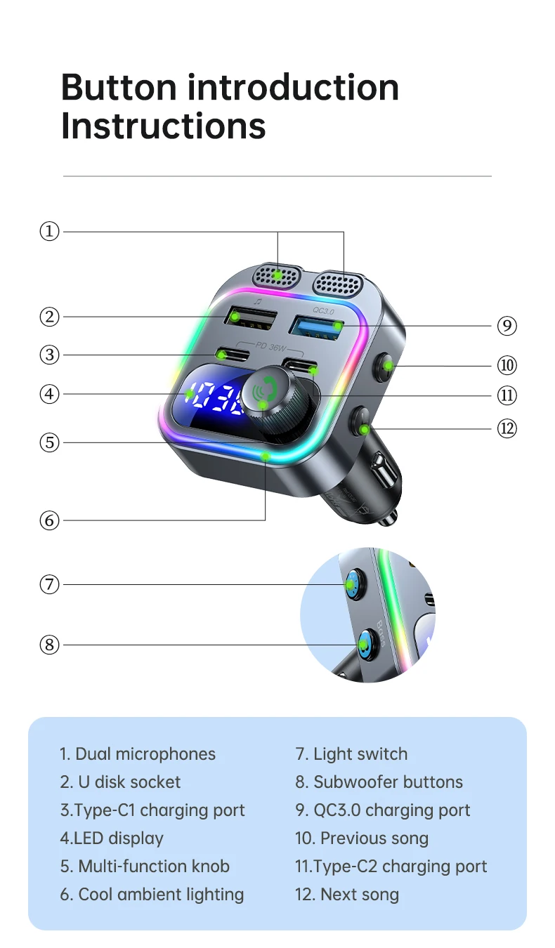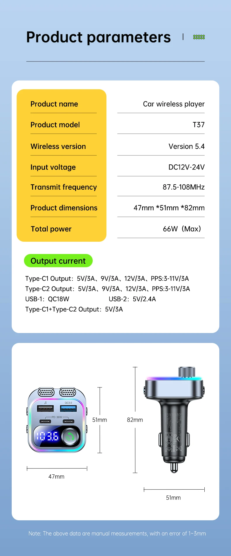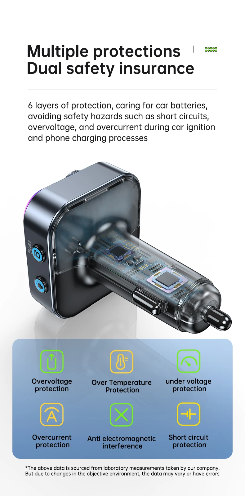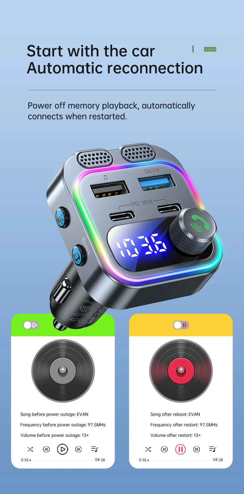 FM transmitter Bluetooth 5.4 dual microphone calling car MP3 U disk music player 66W USB car charging 66W fast charging PD36W