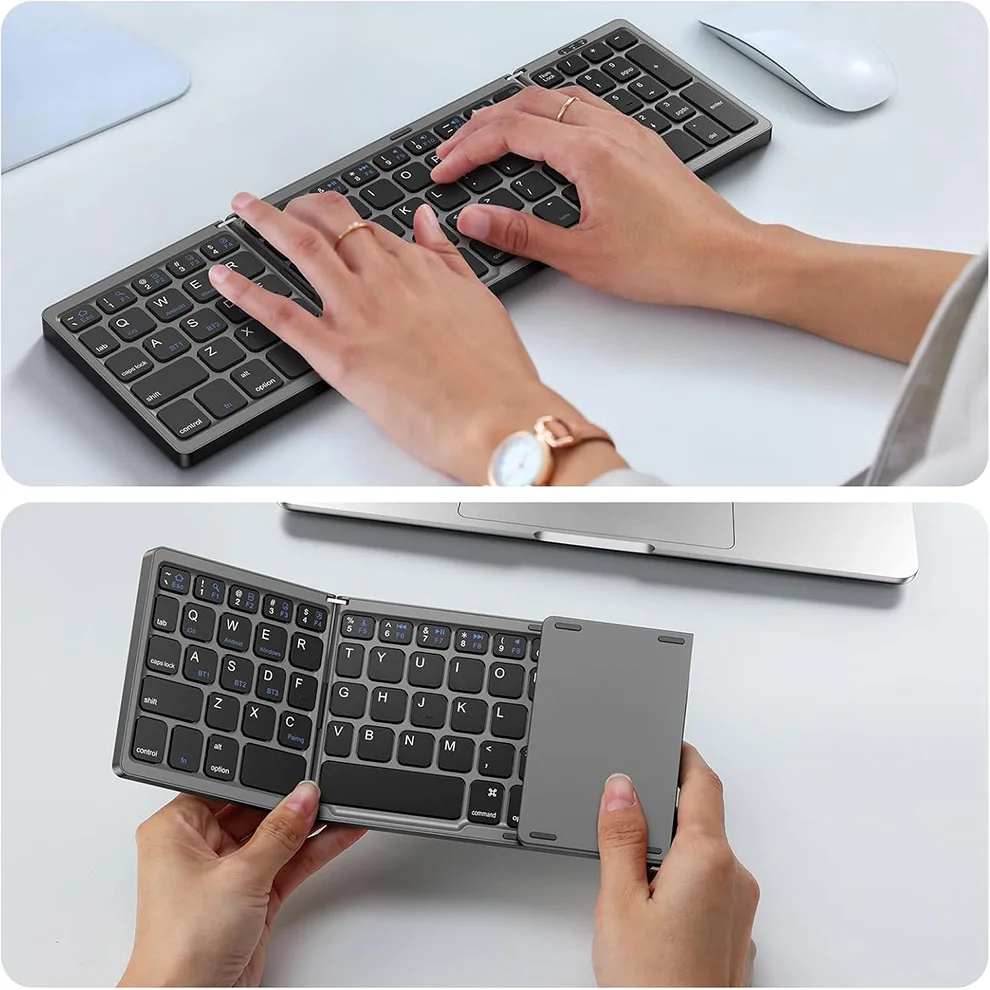 【Rechargeable & Portable】Built-in rechargeable battery, the travel folding keyboard can provide up to 40hours of continuous typing after 2 hours of charging. Folding size 5.94″*3.85″*0.78″, can be easily carried around. The great gift for traveling and business trips!