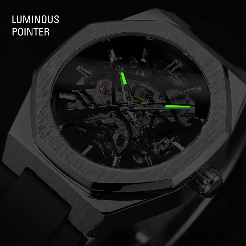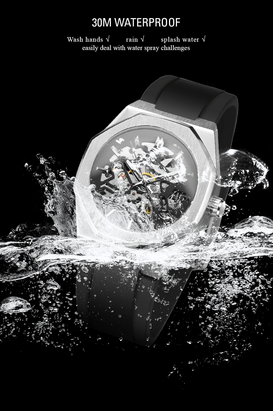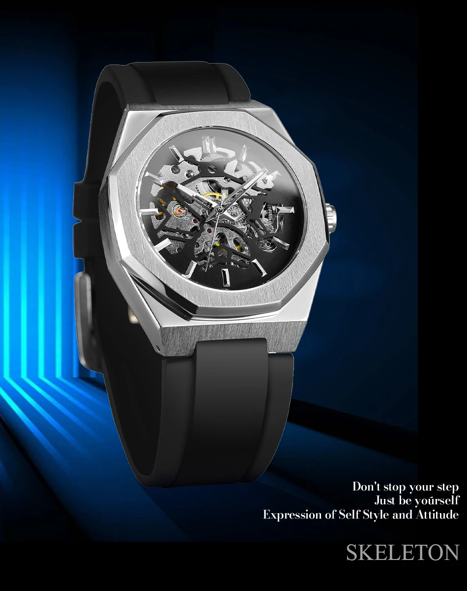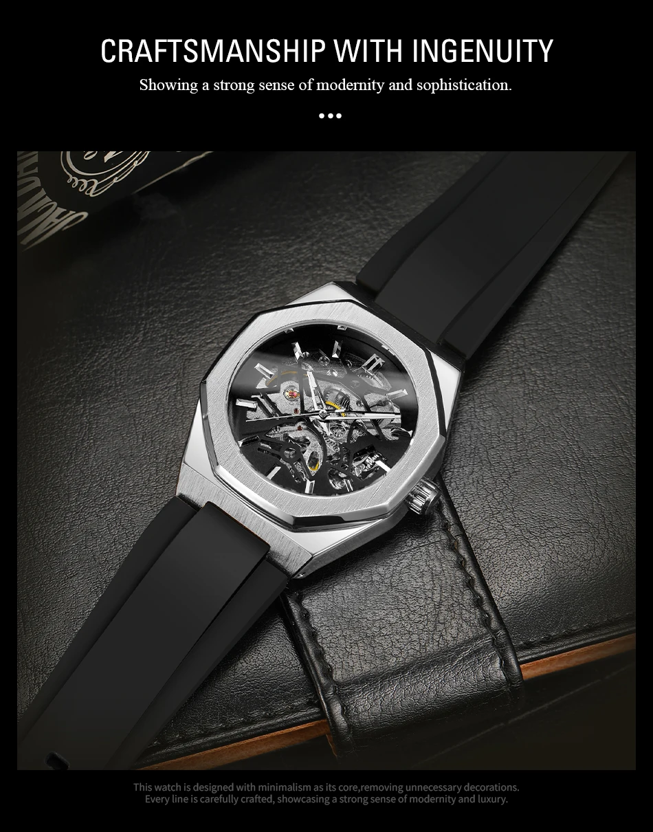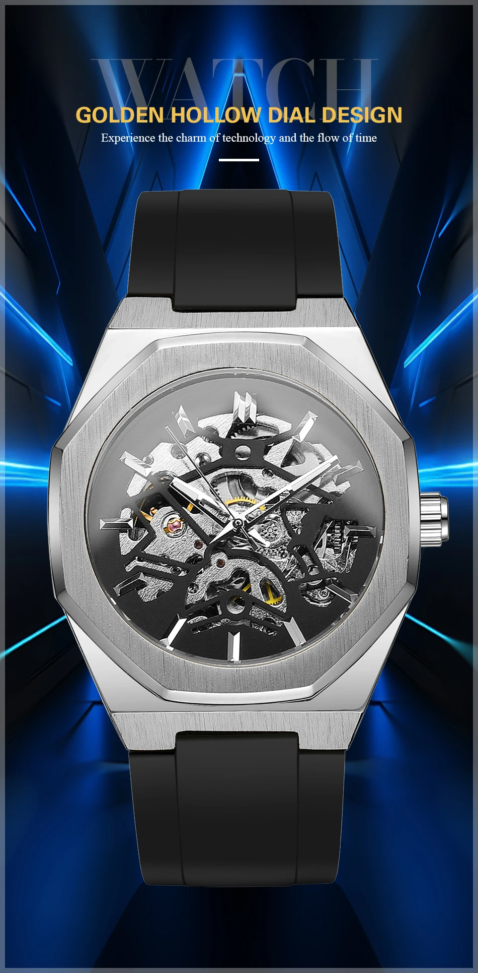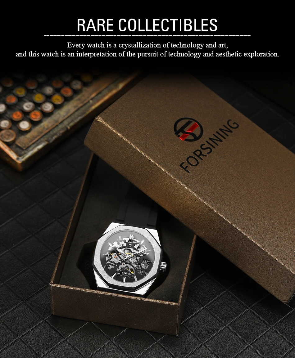 FORSINING Original Factory Octagon Silver Steel Skeleton Mechanical aaa Watch Automatic Movement Clock Rubber Band Luxury Brands