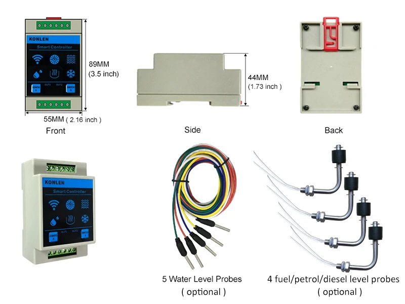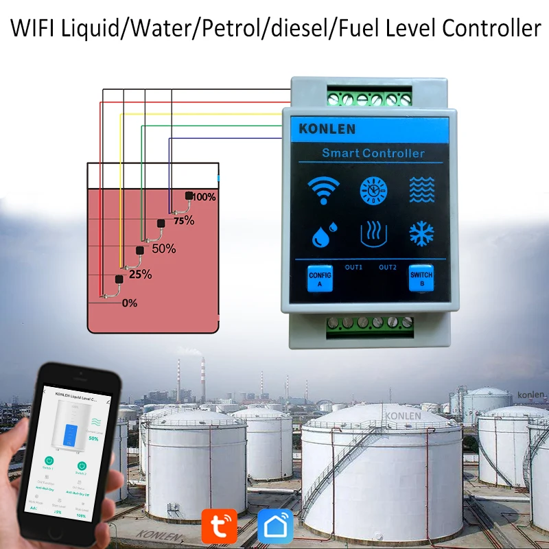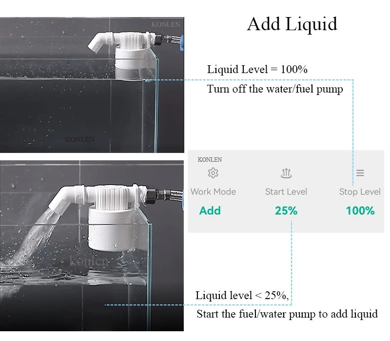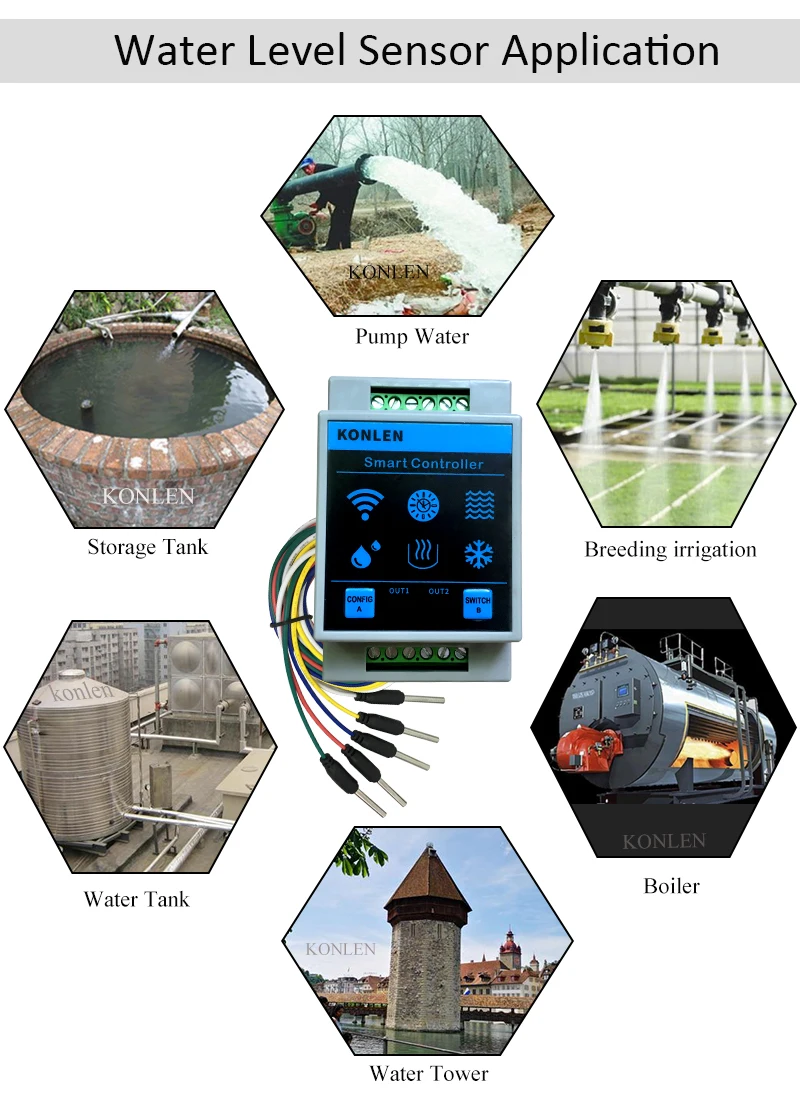 It is a KONLEN WIFI intelligent liquid level controller, which can be set by APP to realize liquid level monitoring, liquid supplement or drainage, high and low liquid level remote APP push alarm notification etc.,