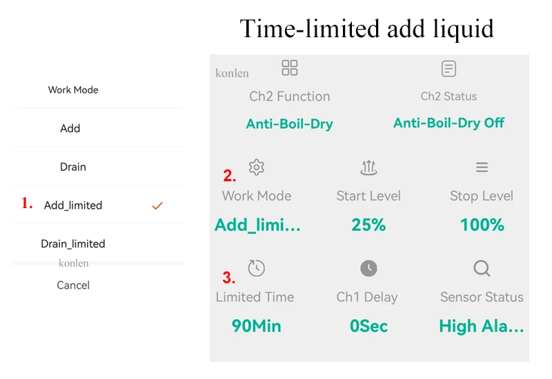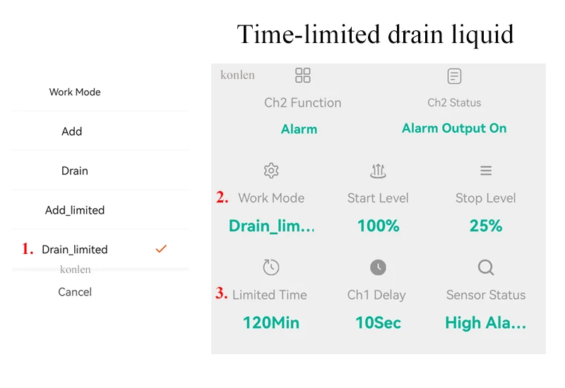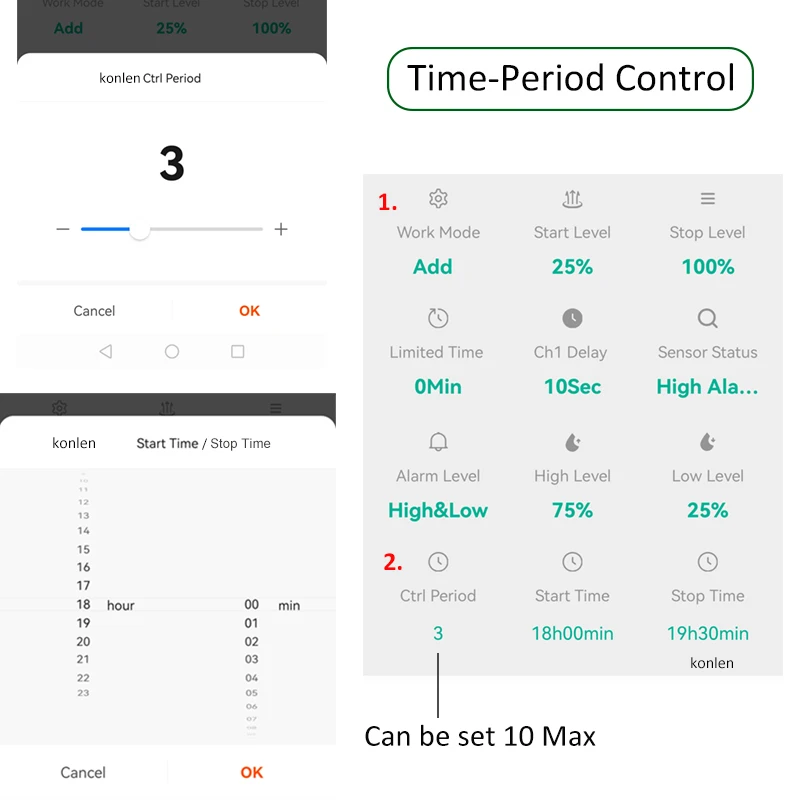 For example, work mode: add liquid, start-liquid level 25%, stop-liquid level 100%, The first control time period: 8:00 to10:00 a.m, the second control time period: 16:00 to18:00 p.m.