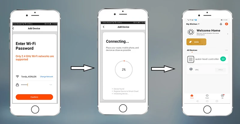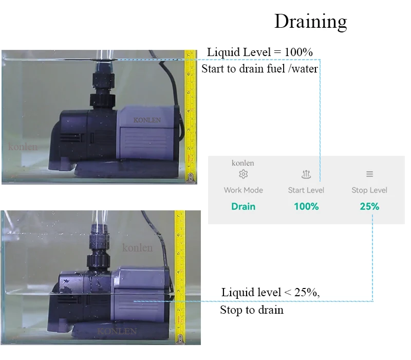 Water level rising: water level < 25% electrode; App display 0%; reach to 25%, App display 25%; reach to 50% , App display 50%; reach to 100%, App display 100%.