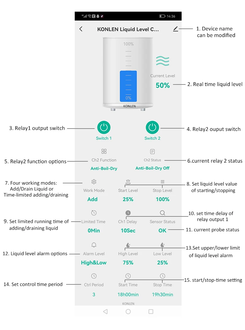 During 8:00 to10:00 a.m and 16:00 to18:00 p.m., it will auto start liquid pump to add liquid when level is less than 25%, auto stop to add liquid when level reaches to 100%. Outside of the control time period, users can turn on/turn off relay output manually.
