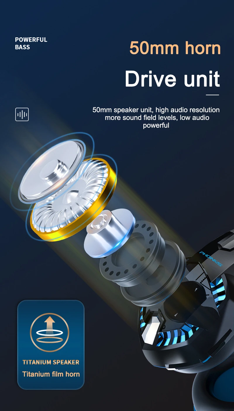 50mm speaker unit, high audio resolution and more sound field levels, low audio frequency, powerful