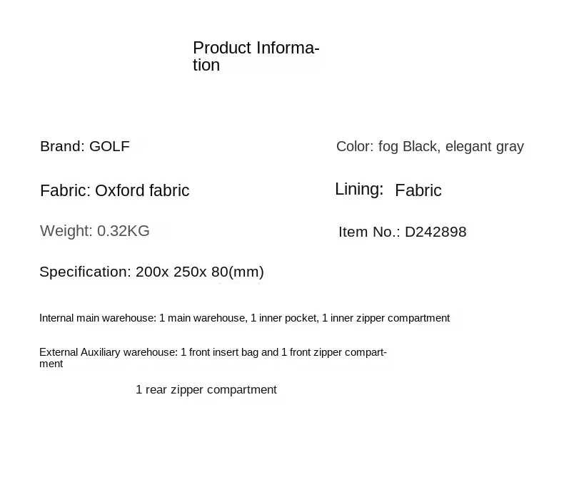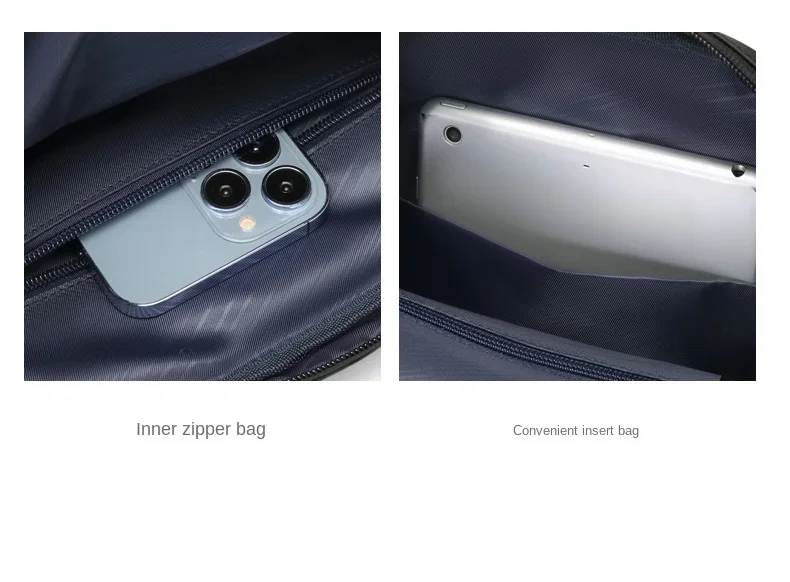 Main compartment: 1 internal insertion bag, 1 internal zipper compartment.
