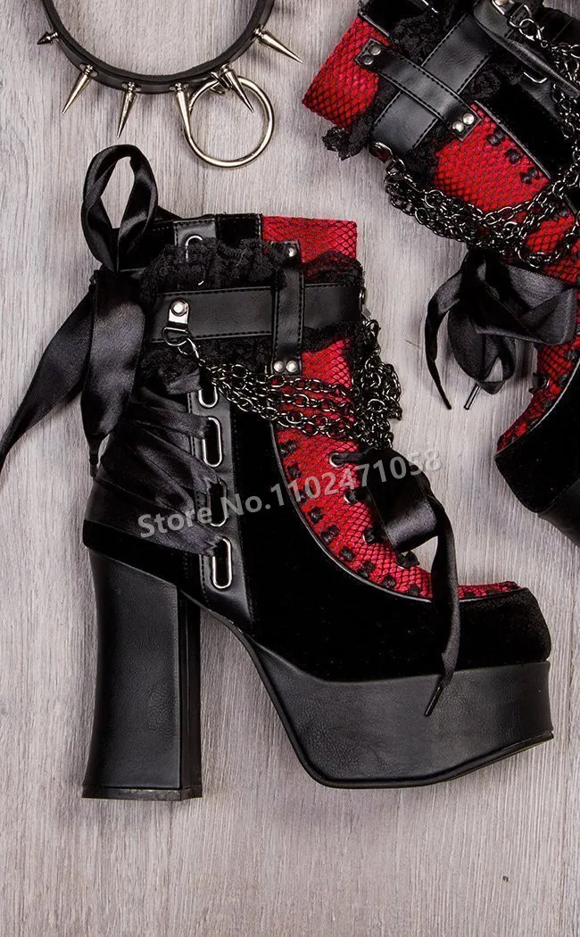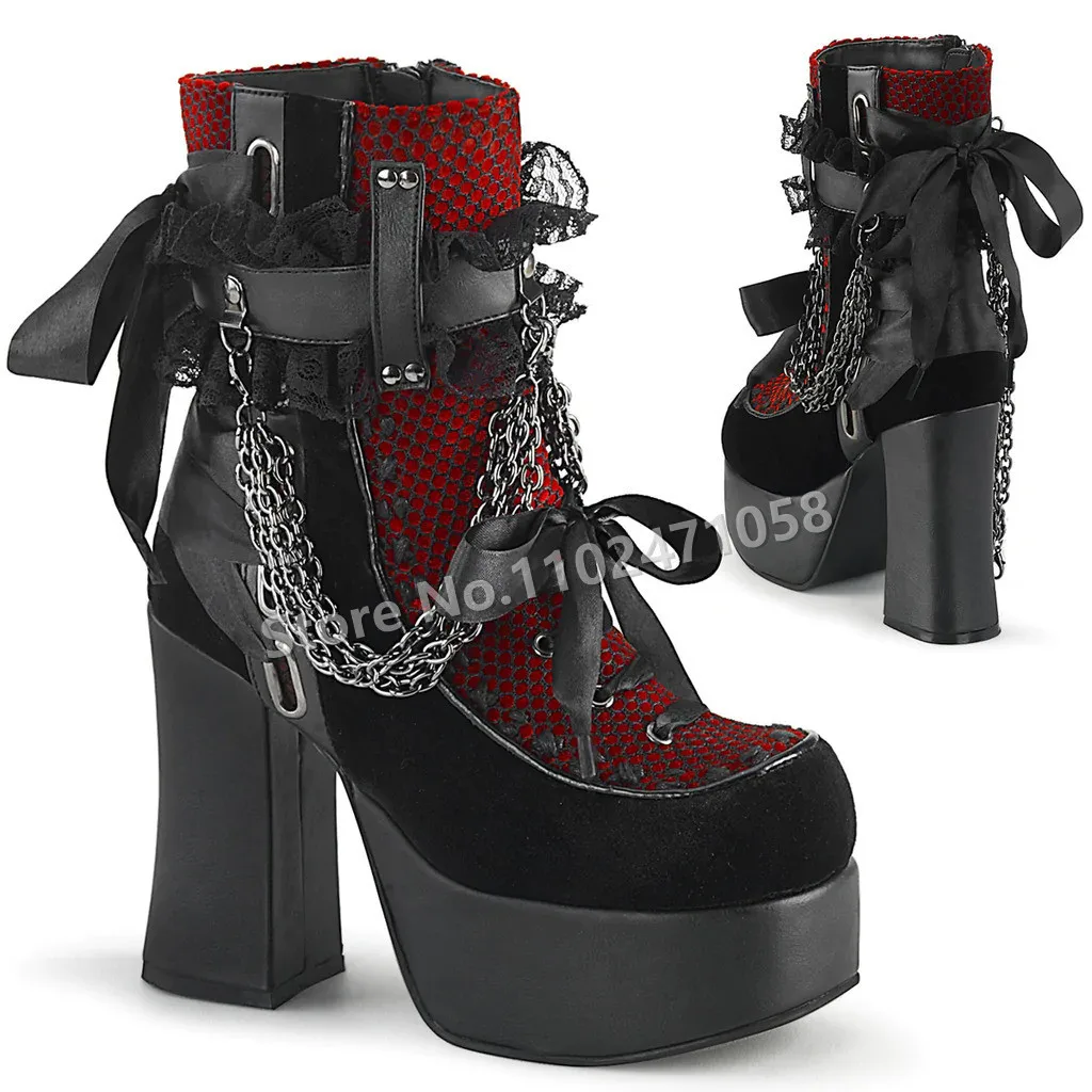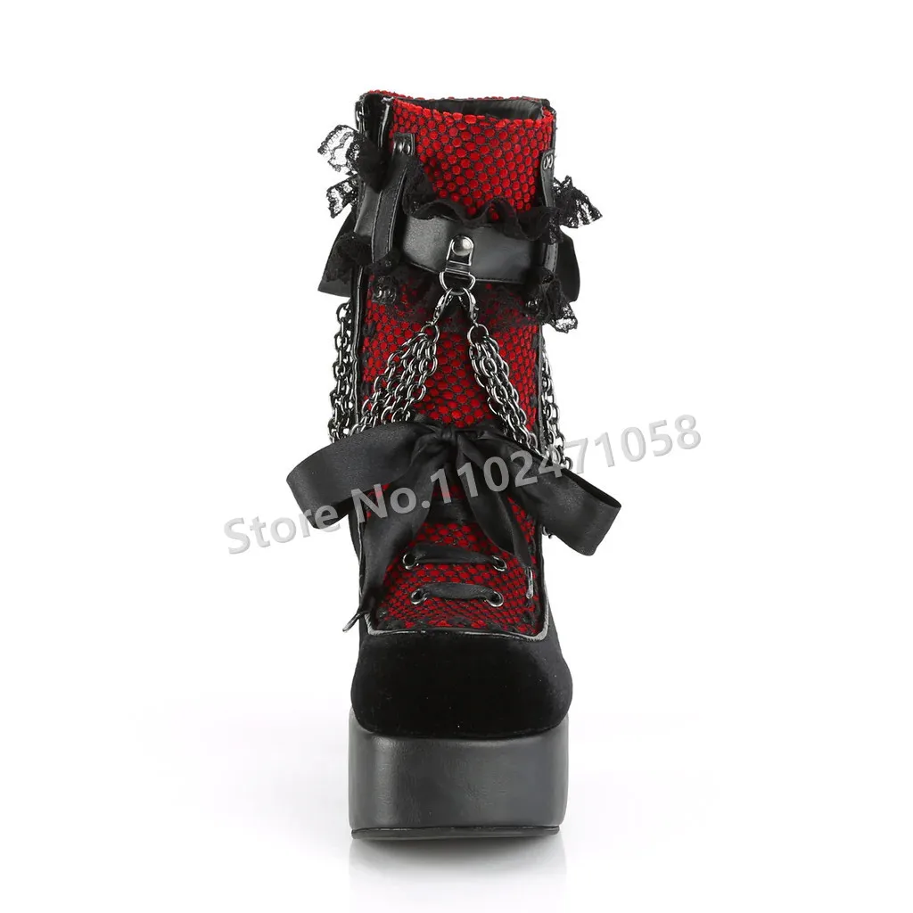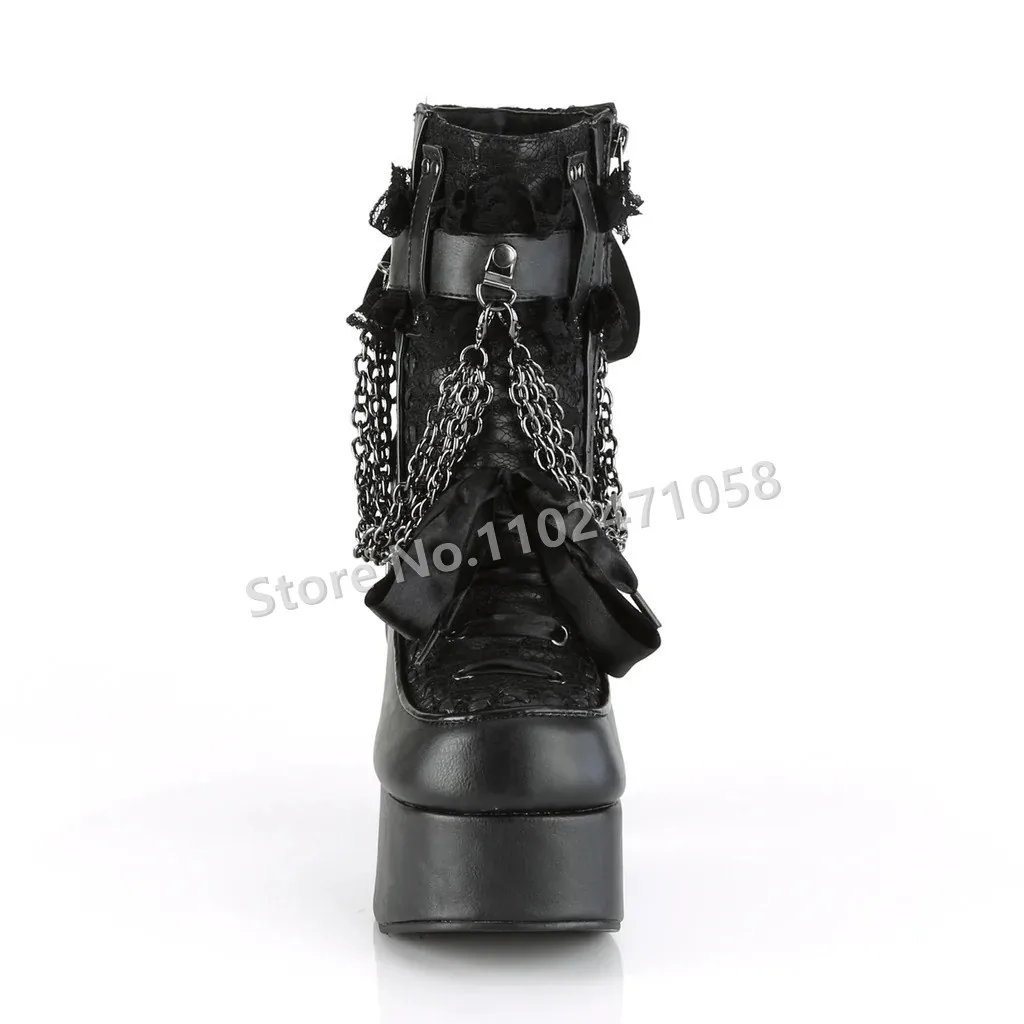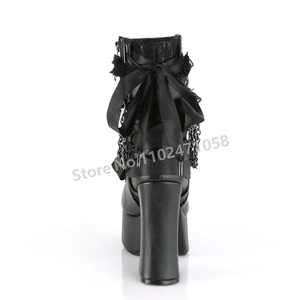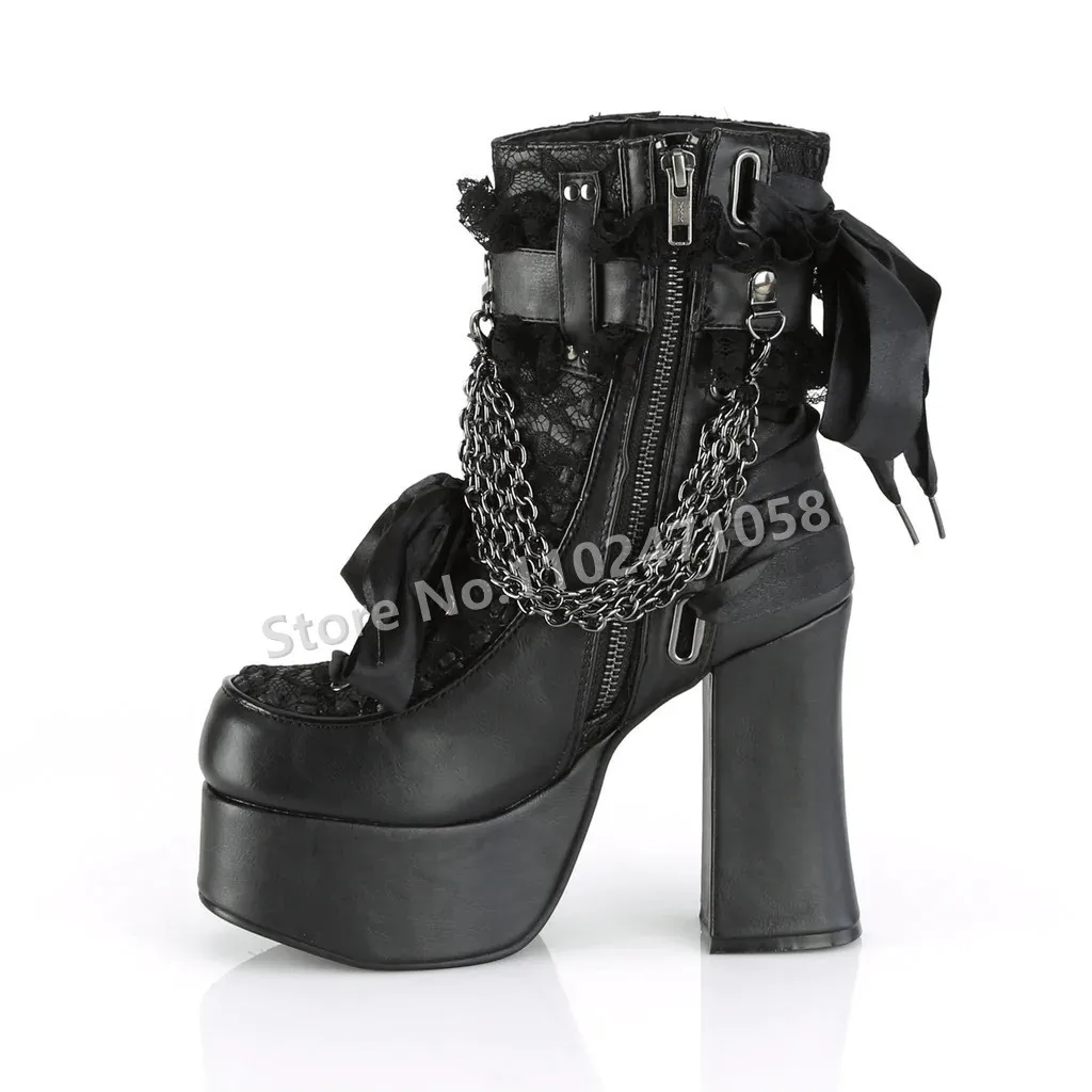 Gothic Style Chain Butterfly Knot Women Short Boots Retro Round Toe Square Heel Chunky Platform Ankle Boots Ladies Party Shoes
