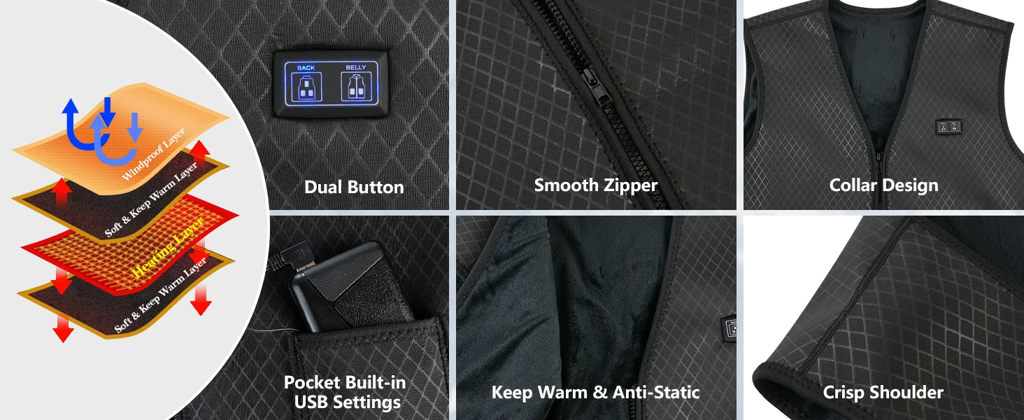 💝【5 heating zones and 3 heating layers】 The upgraded vest heating element generates heat before and after, Back, waist and abdomen.Make you feel warm ithin 360 degrees, Promote blood circulation,Effectively relieve back pain, The heated vest can be used for 3 heating settings. The intelligent heating system can be operated in the range of 40 ° C / 104 ° F to 60 ° C / 140 ° F.