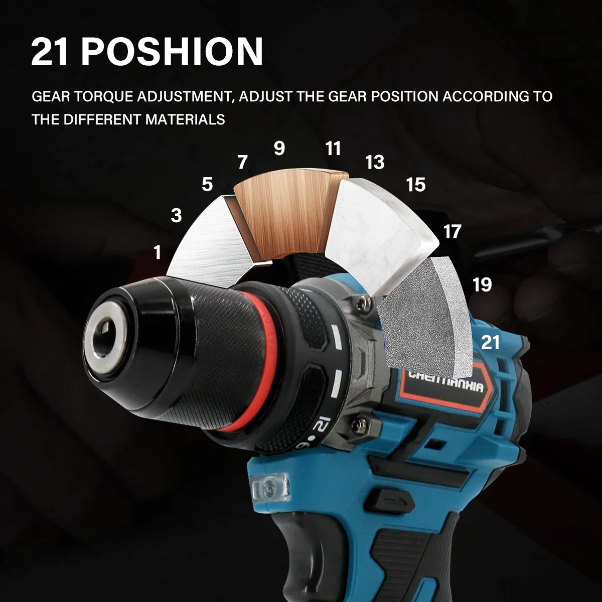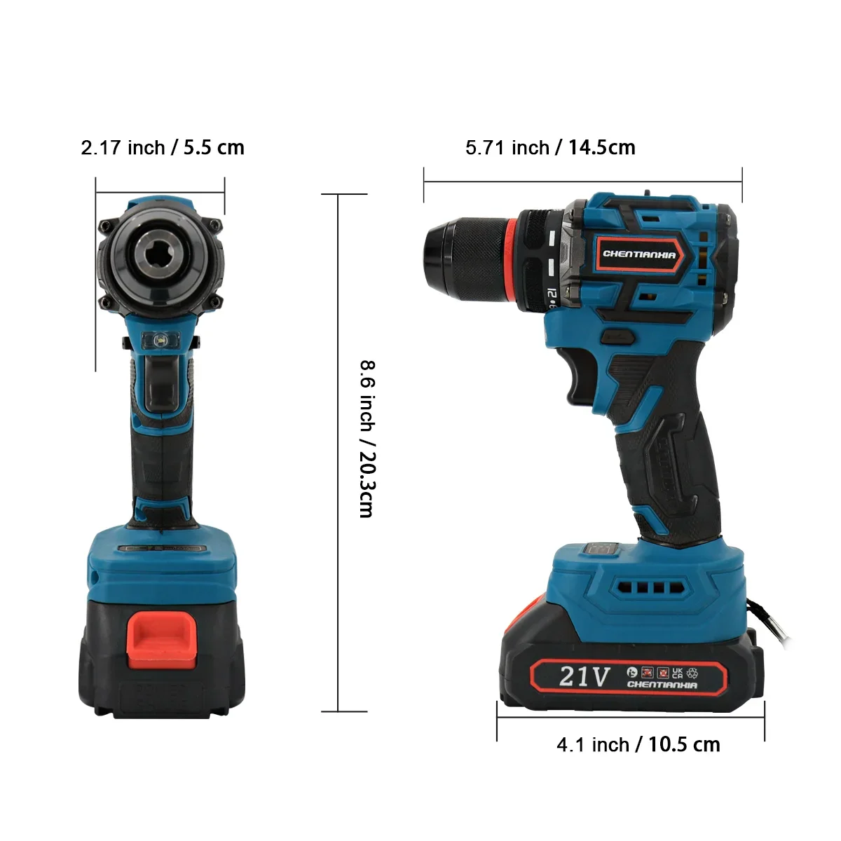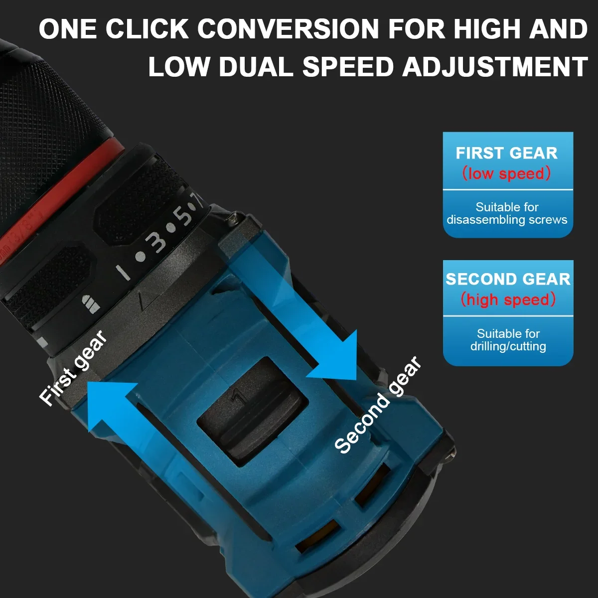 – Powerful electric drill can provide up to 50N.M torque, 25+3 position clutch can better adjust torque accuracy. 2 No-load Speed transmission (0-450 and 0-1450 RPM) for a range of drilling tightening or unscrewing screws on wood, metal and plastic. 3 in 1 working mode (Hammer, Driver, Drill).