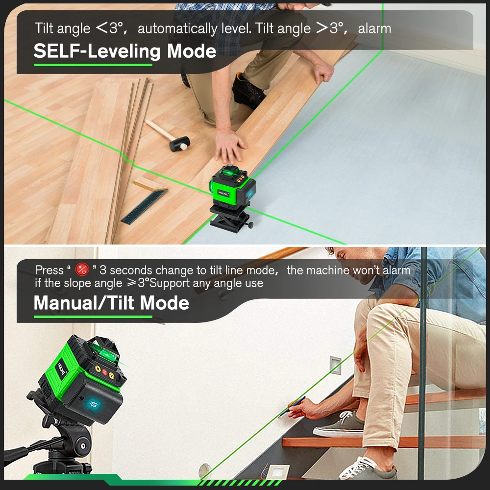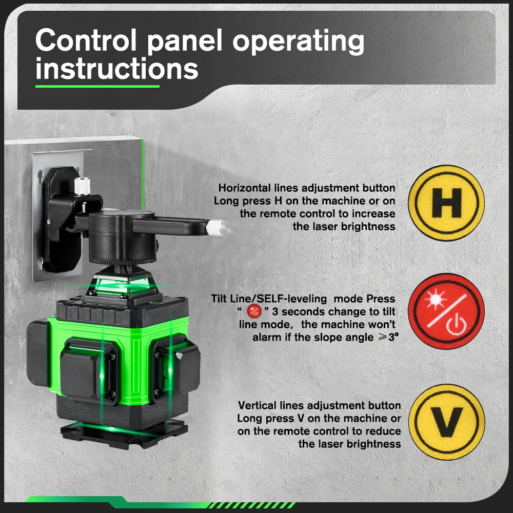 -Two control modes: Mobile APP remote control and Bluetooth remote control, you can select the lines you needed by the remoter when you are inconvenient to move the laser level.