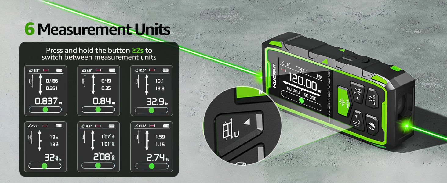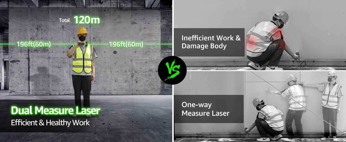 【High Efficiency Dual Measurement Tool】Bilateral laser measure can do two-direction measurements simultaneously. Measure reference can be adjusted to get bidirectional/unidirectional measurements for different measure needs. No need to move the medidor laser measuring tool frequently, greatly improves efficiency and saves time. Max bidirectional measure distance up to 393Ft, unidirectional measure distance up to 196Ft, ±1/16 inch high accuracy. A good choice for replacing the laser tape measure.