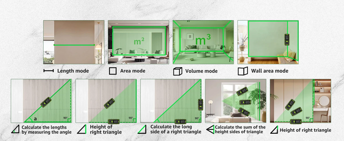 【9 Measure Modes & Multiple Functions】This digital room measuring device provides 9 measurement modes -Distance/Area/Volume/Angle/Wall area, and 4 pythagorean modes, which can meet your various measurement needs in different scenarios. Switchable M/In/Ft/Ft+In units, 100 groups of data can be stored for retrieval, with addition and subtraction mode for data calculation effectively, self calibration mode. You can also get the midpoint, max, and min value easily by continuous measuring mode.