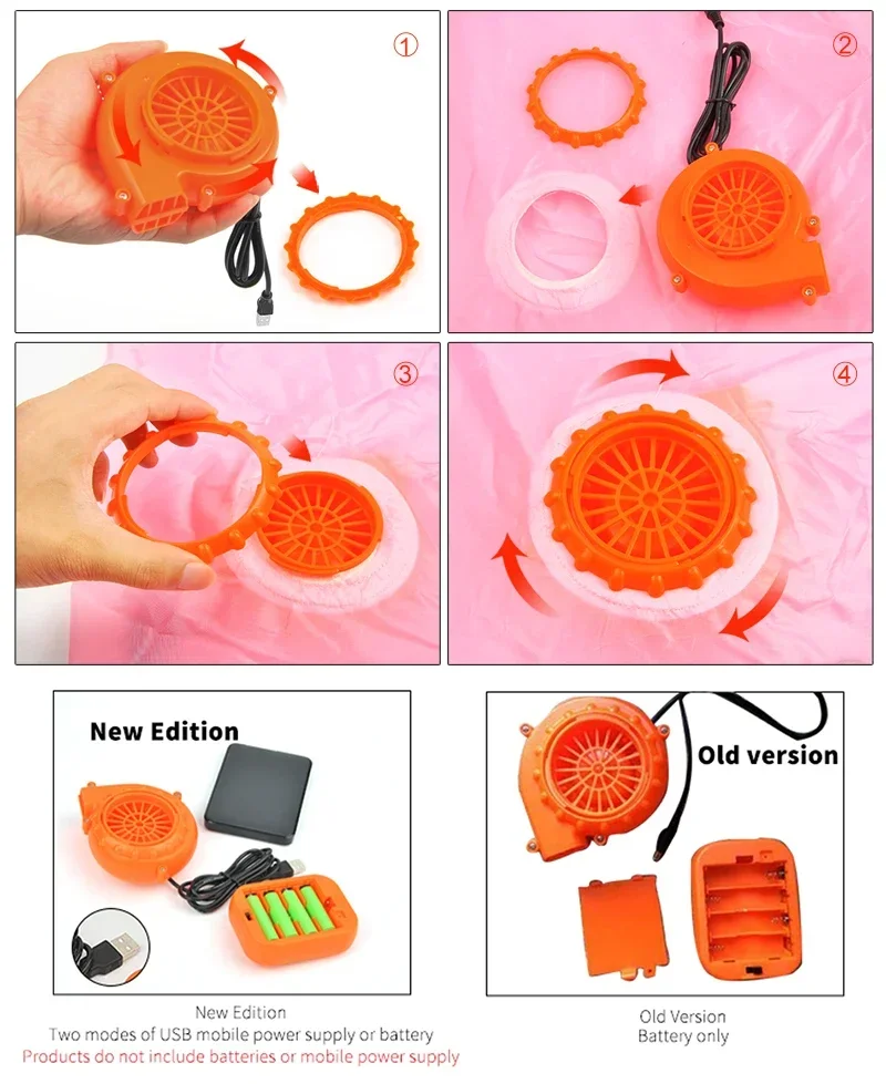 A: There is fan fixed on the costume,connect the fan into battery pack(powered by 4 AA batteries)